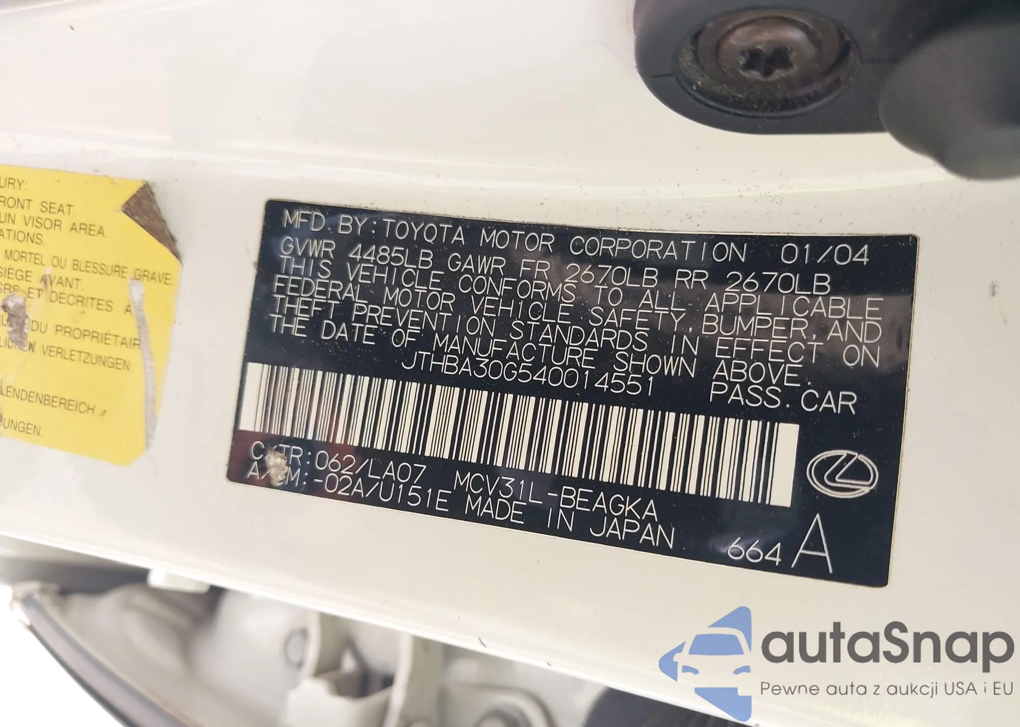 • VIN: JTHBA30G540014551