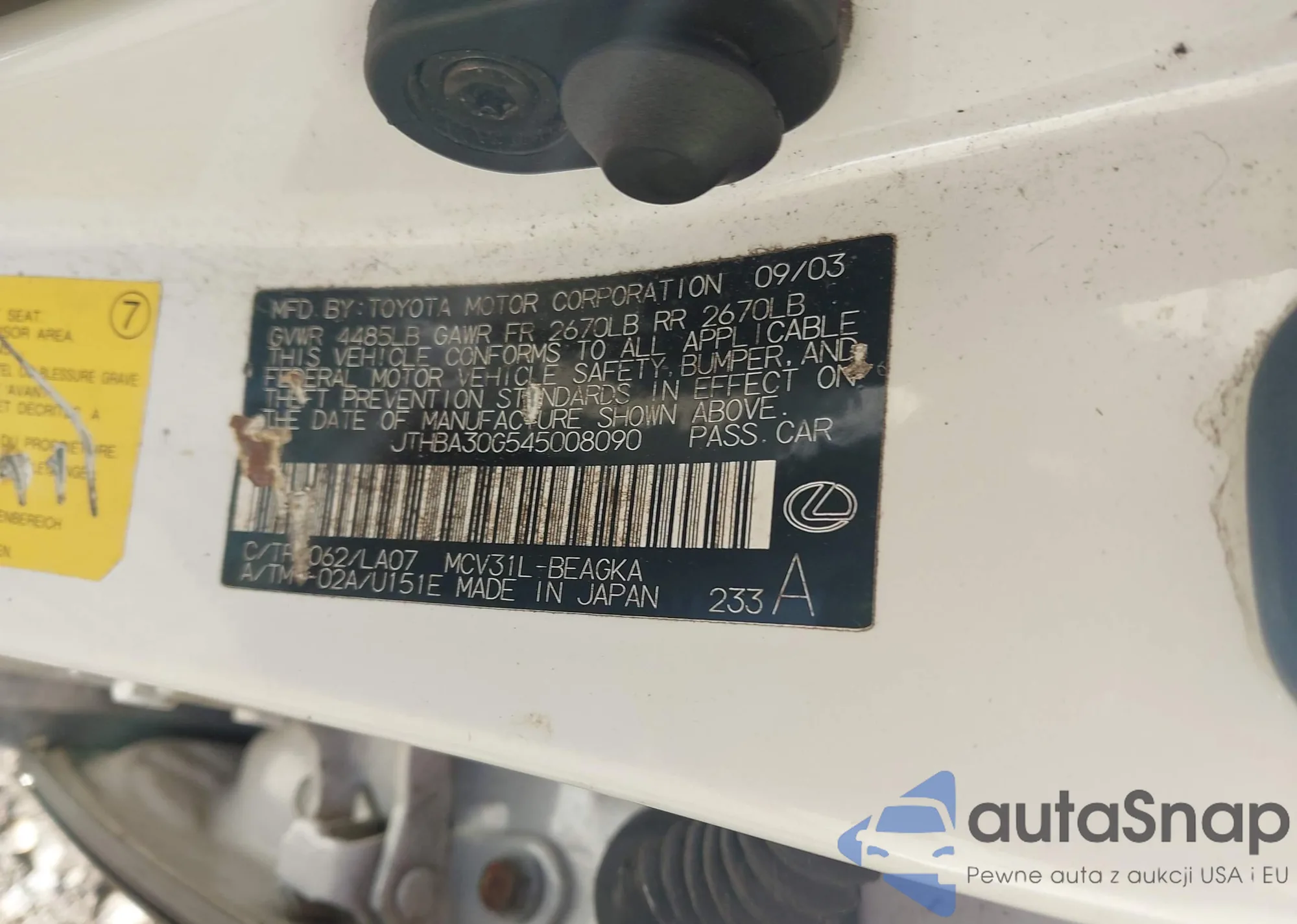 • VIN: JTHBA30G545008090