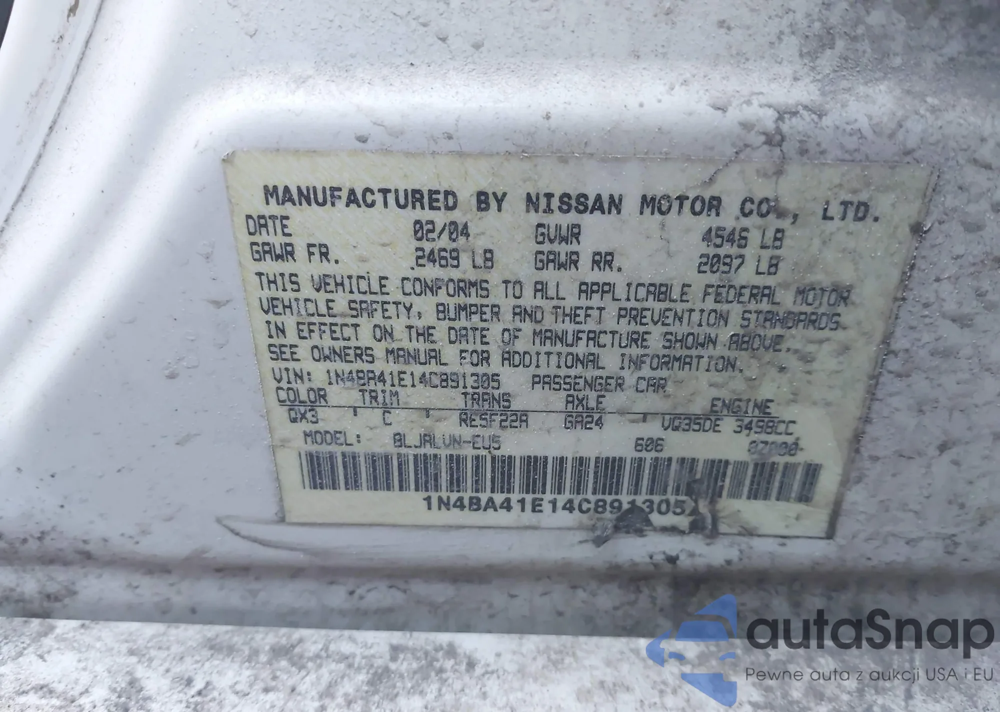 Автомобиль Nissan Maxima 2004 (VIN 1N4BA41E14C891305) ранее не участвовал в торгах. Документы чистые, пробег соответствует или ниже среднего по рынку. Продаётся страховой компанией — рекомендуем покупку. Доставка в порт займет около 6–8 недель.