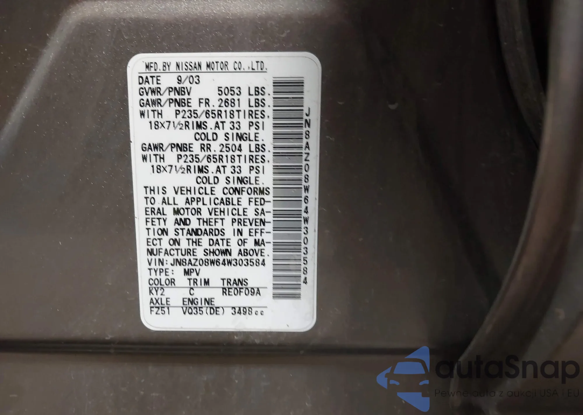 Автомобиль Nissan Murano 2004 (VIN JN8AZ08W64W303584) ранее не участвовал в торгах. Документы чистые, пробег соответствует или ниже среднего по рынку. Продаётся страховой компанией — рекомендуем покупку. Доставка в порт займет около 6–8 недель.