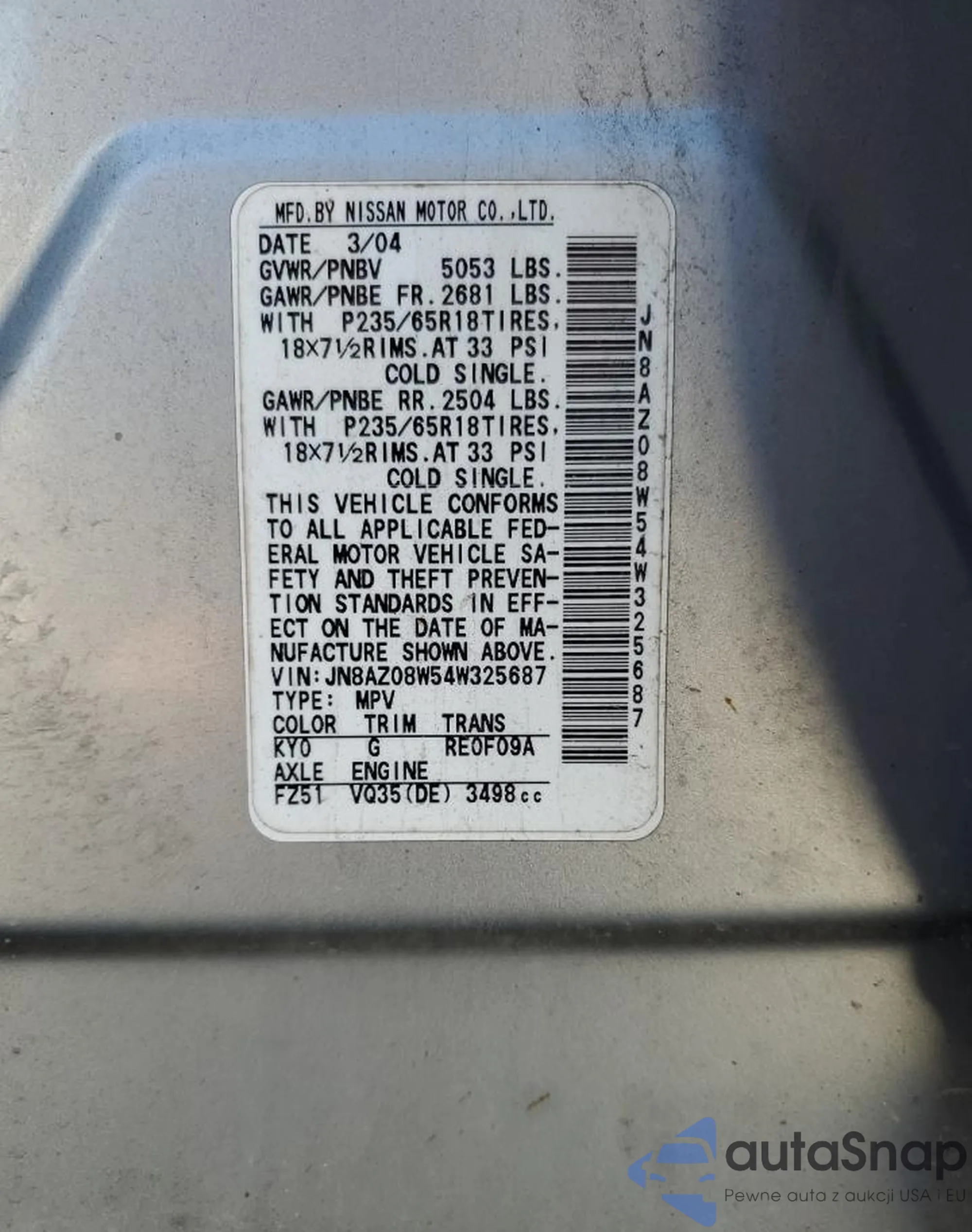 Автомобиль Nissan Murano 2004 (VIN JN8AZ08W54W325687) продаётся непроверенным продавцом. Рекомендуем проверить отчет Carfax и подтвердить возможность регистрации перед покупкой.