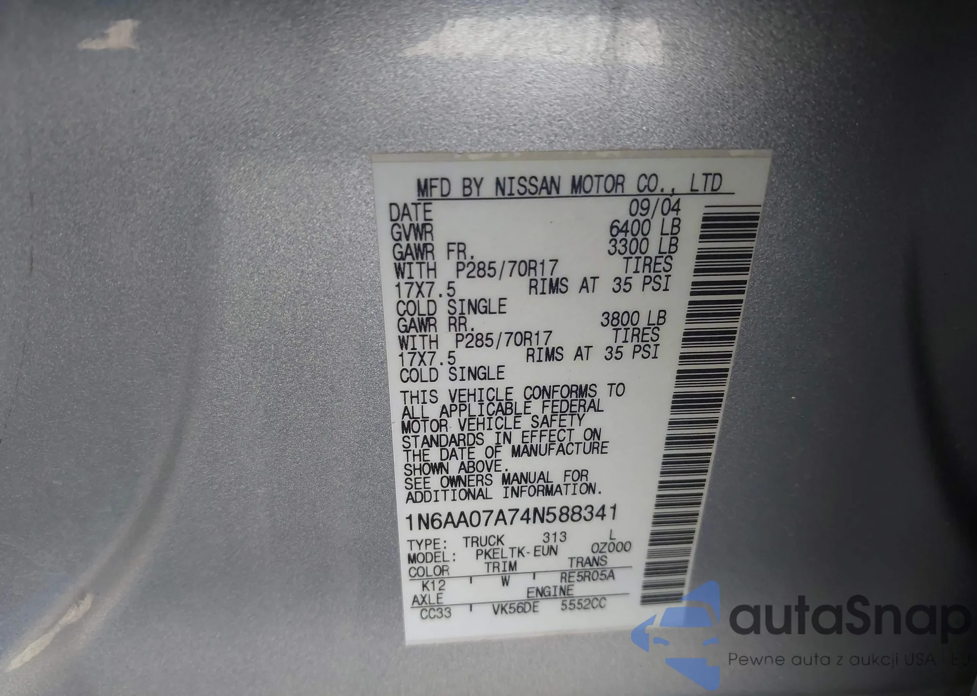 Автомобиль Nissan Titan 2004 (VIN 1N6AA07A74N588341) ранее не участвовал в торгах. Документы чистые, пробег соответствует или ниже среднего по рынку. Продаётся страховой компанией — рекомендуем покупку. Доставка в порт займет около 6–8 недель.