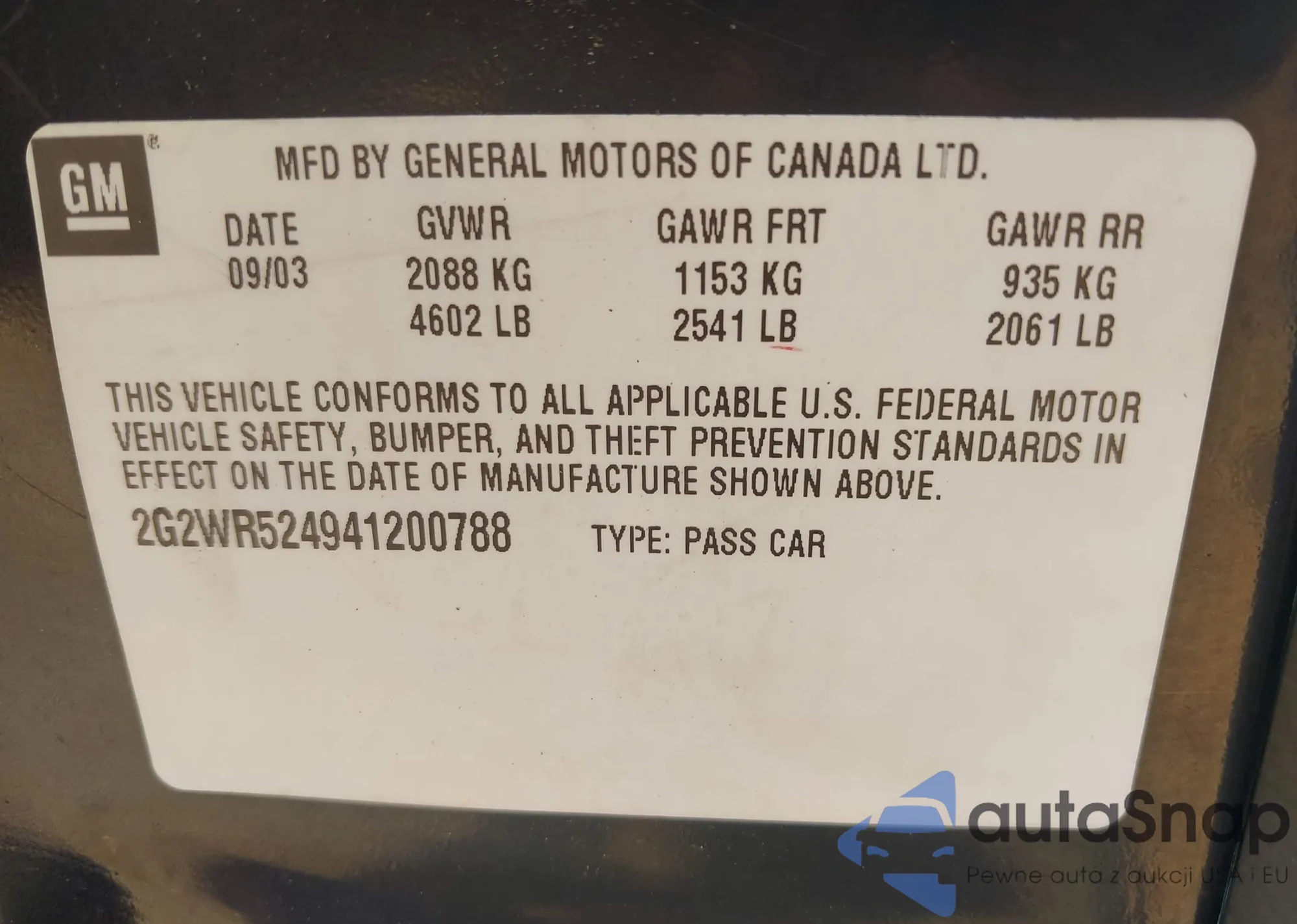 VIN: 2G2WR524941200788