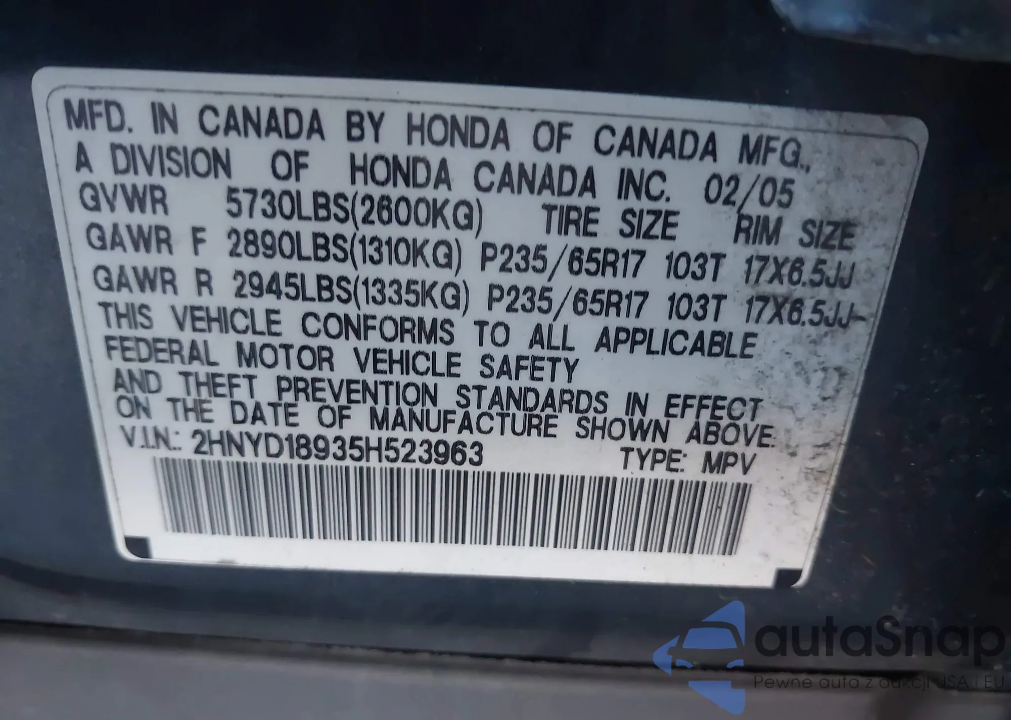VIN: 2HNYD18935H523963