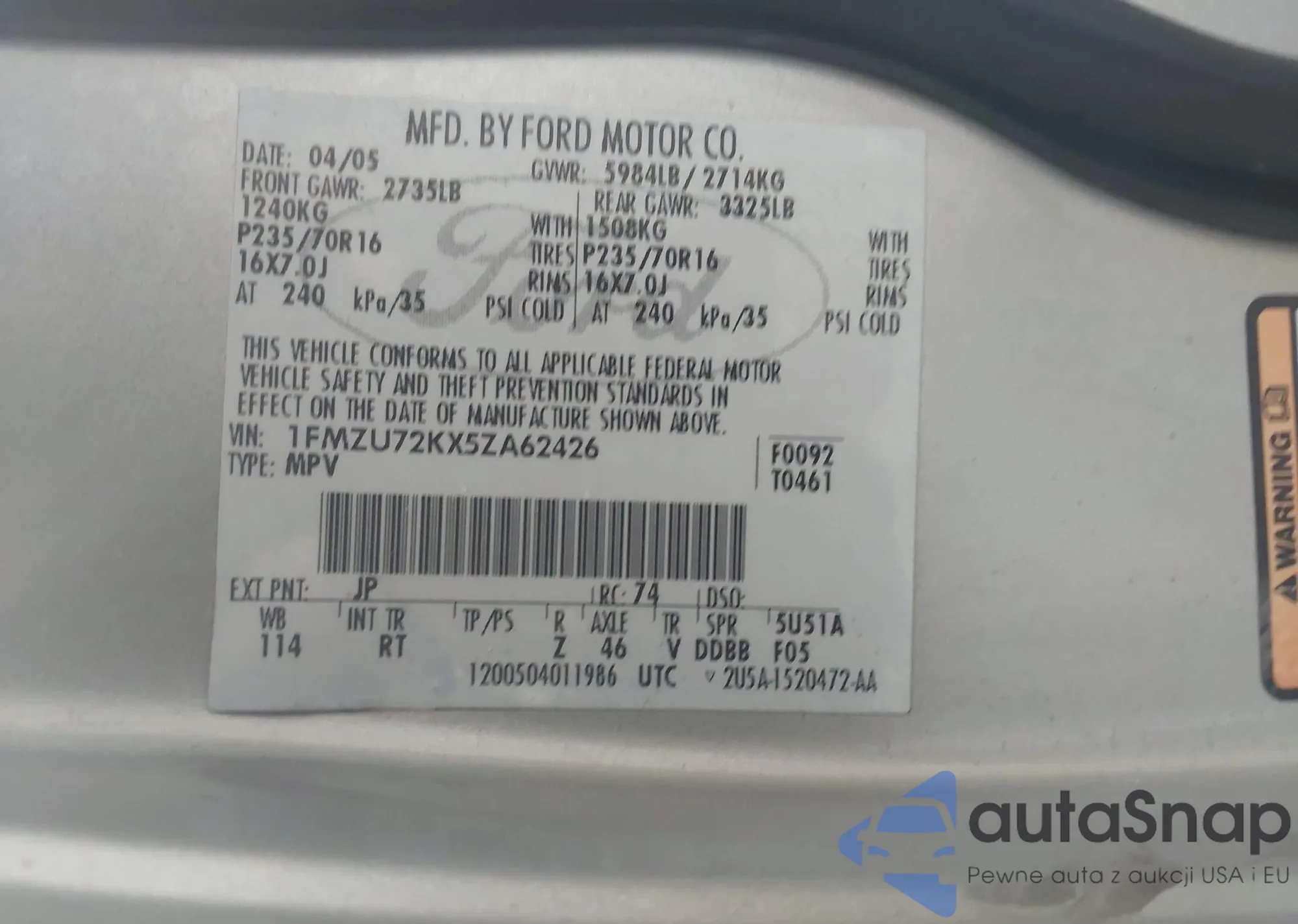 VIN: 1FMZU72KX5ZA62426