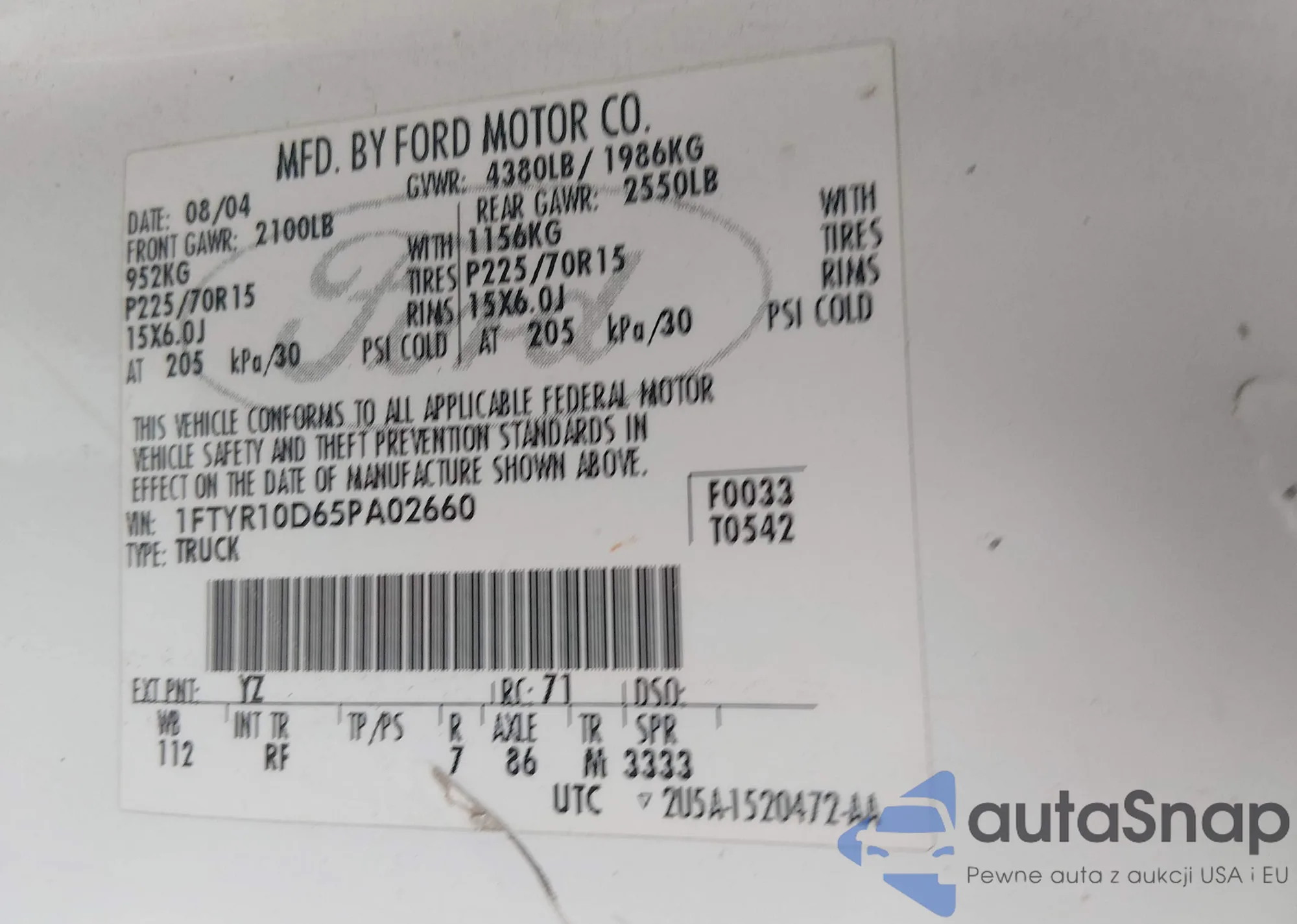 • VIN: 1FTYR10D65PA02660