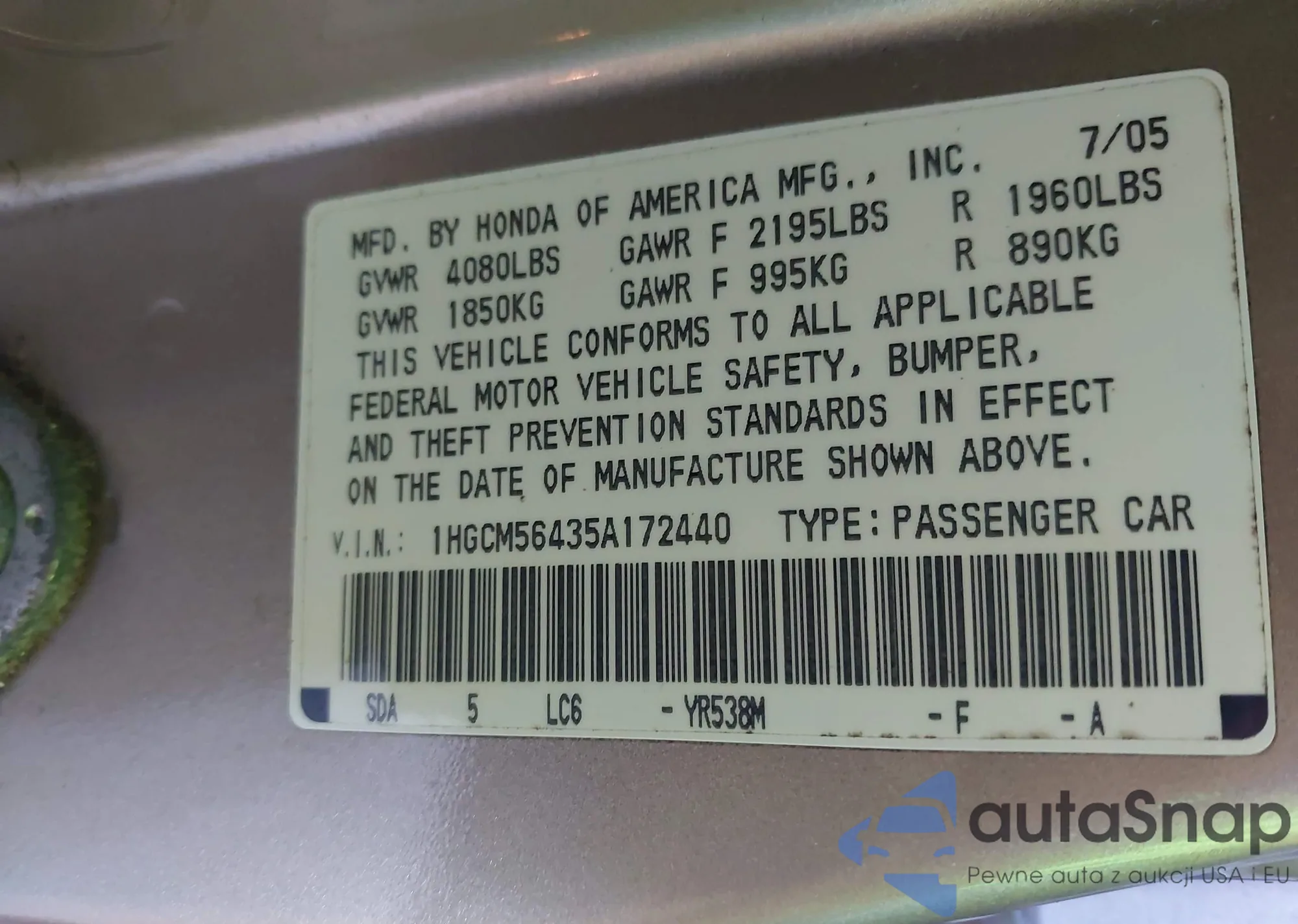 VIN: 1HGCM56435A172440