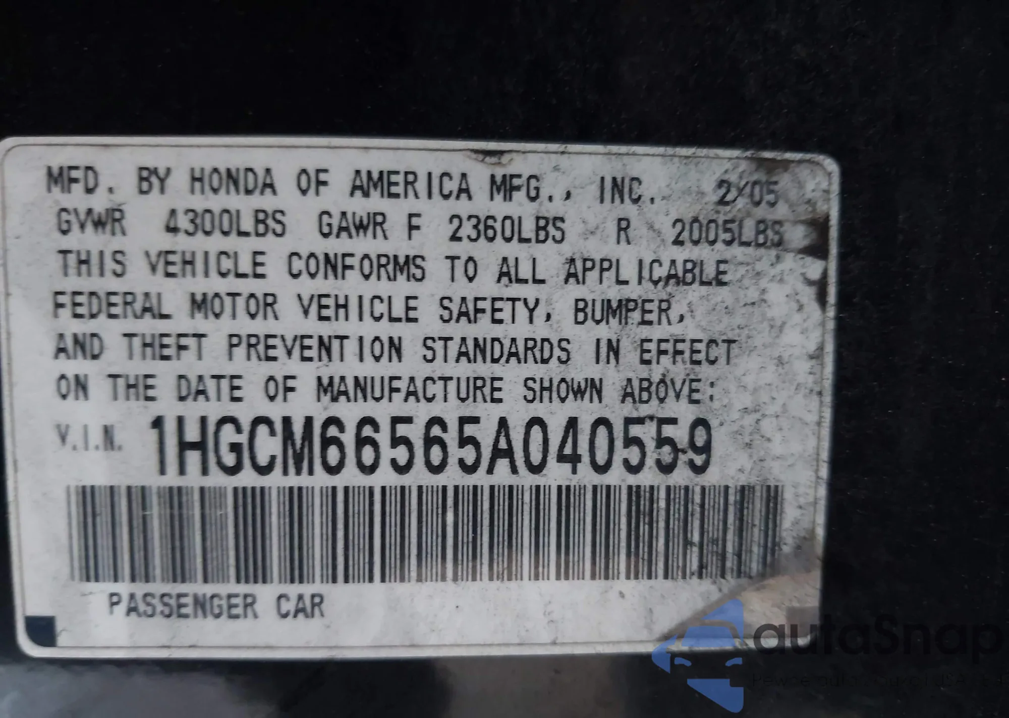 VIN: 1HGCM66565A040559