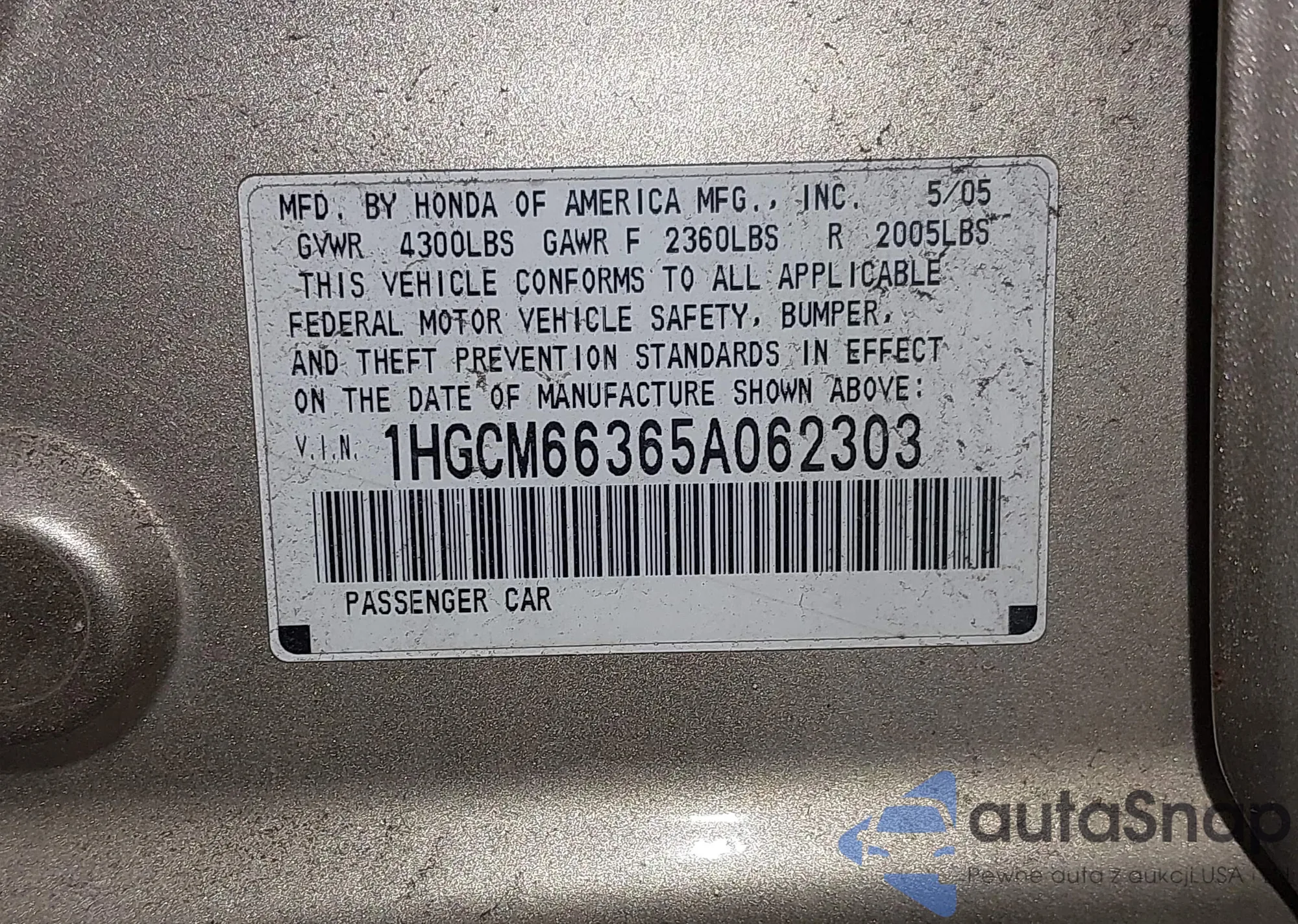 VIN: 1HGCM66365A062303