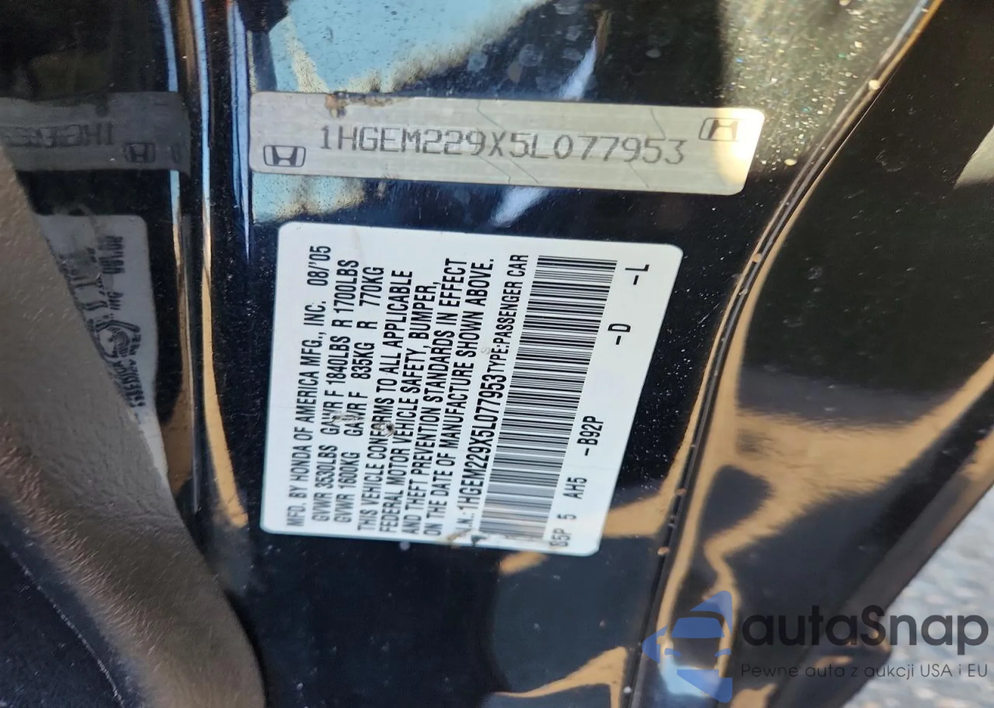 Автомобиль Honda Civic 2005 (VIN 1HGEM229X5L077953) ранее не участвовал в торгах. Документы чистые, пробег соответствует или ниже среднего по рынку. Продаётся страховой компанией — рекомендуем покупку. Доставка в порт займет около 6–8 недель.