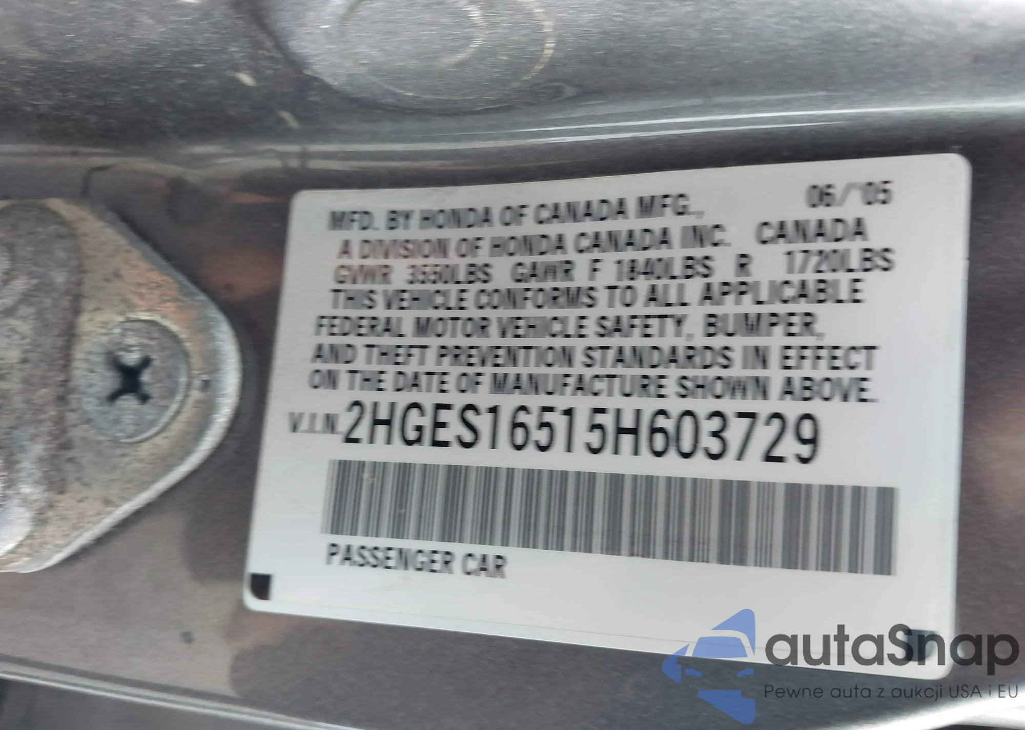 Автомобиль Honda Civic 2005 (VIN 2HGES16515H603729) ранее не участвовал в торгах. Документы чистые, пробег соответствует или ниже среднего по рынку. Продаётся страховой компанией — рекомендуем покупку. Доставка в порт займет около 6–8 недель.