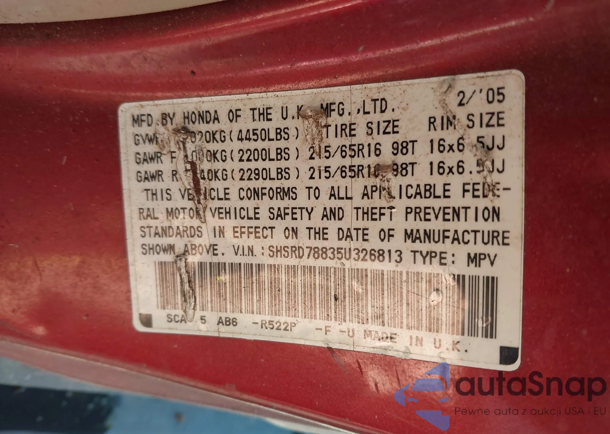 • VIN: SHSRD78835U326813