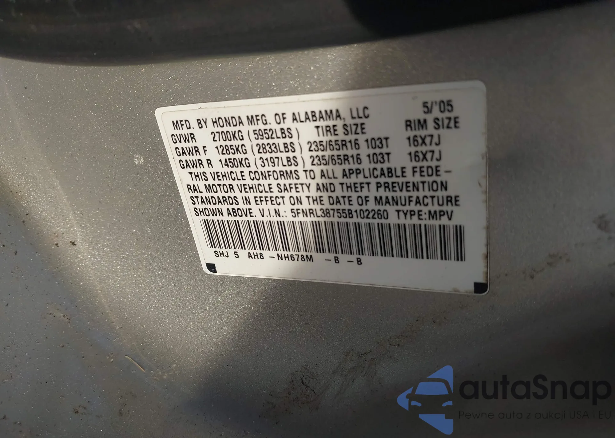 • VIN: 5FNRL38755B102260