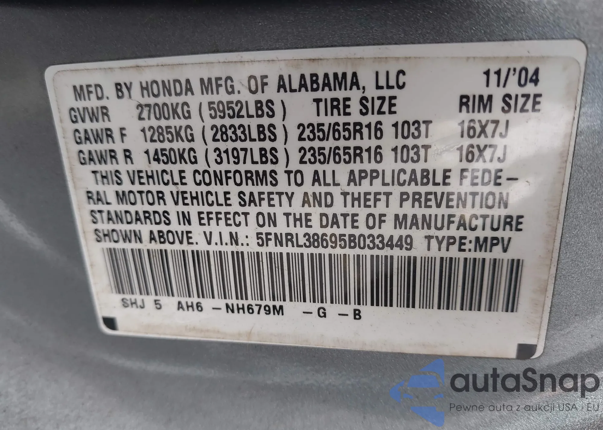 VIN: 5FNRL38695B033449
