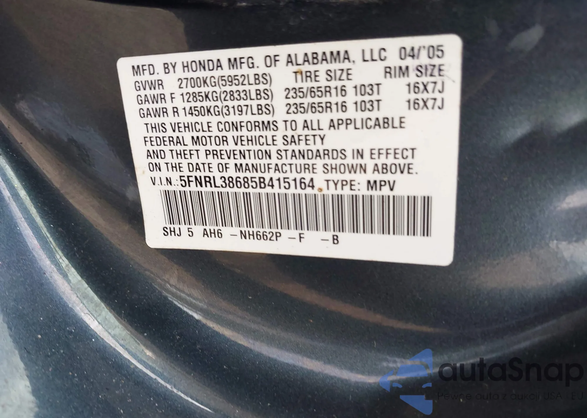 VIN: 5FNRL38685B415164