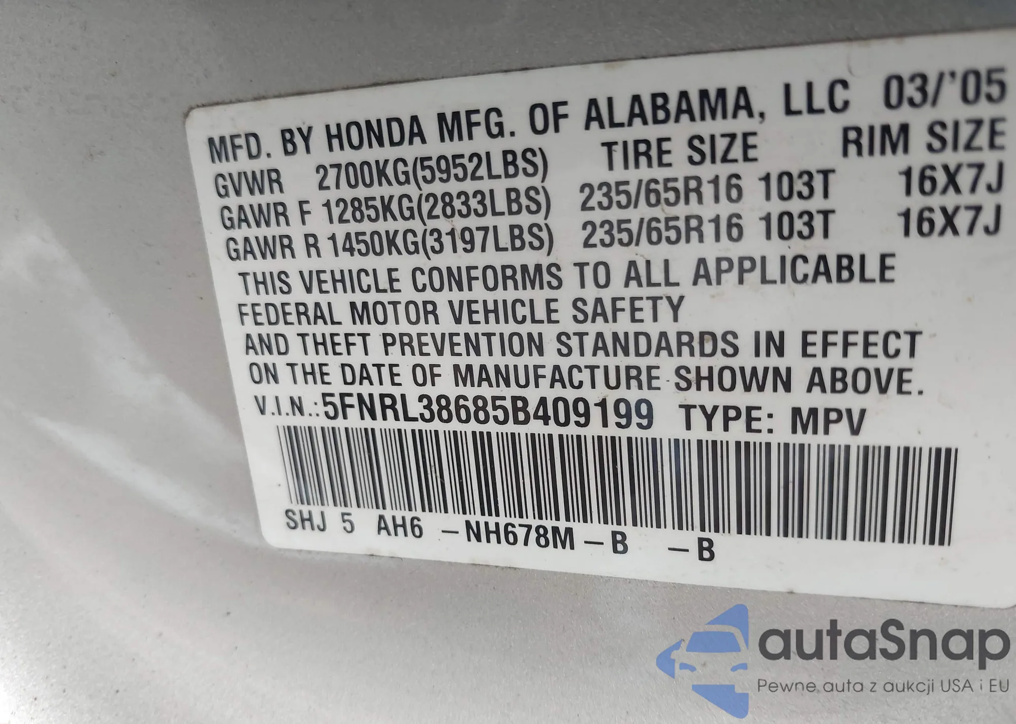VIN: 5FNRL38685B409199