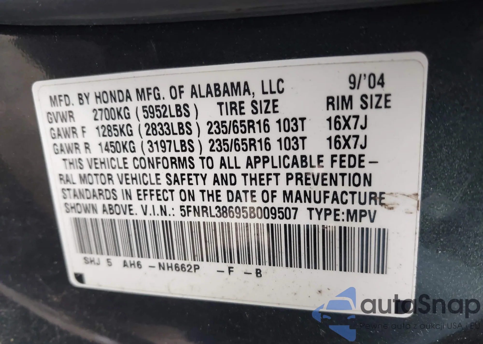 VIN: 5FNRL38695B009507