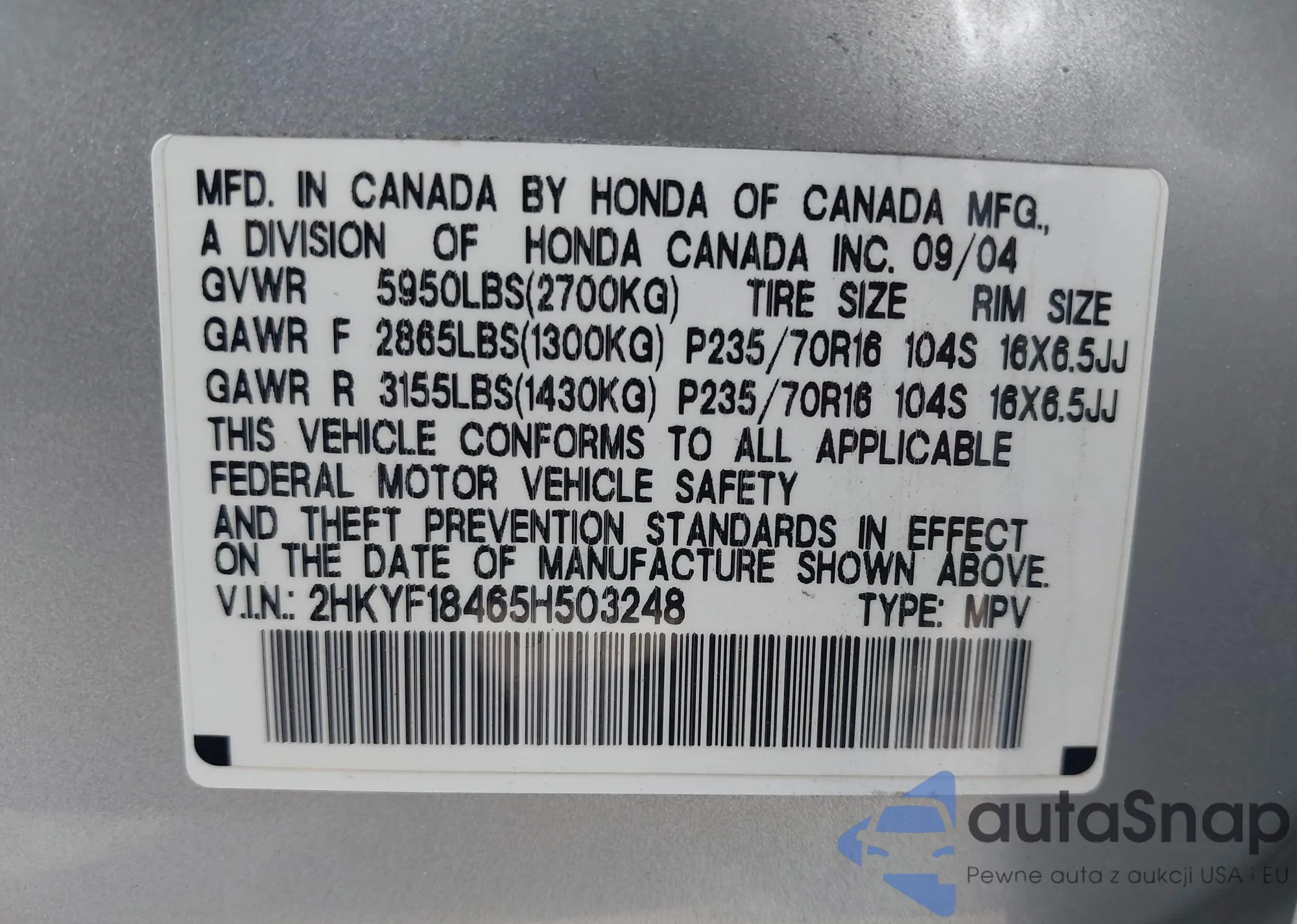 • VIN: 2HKYF18465H503248