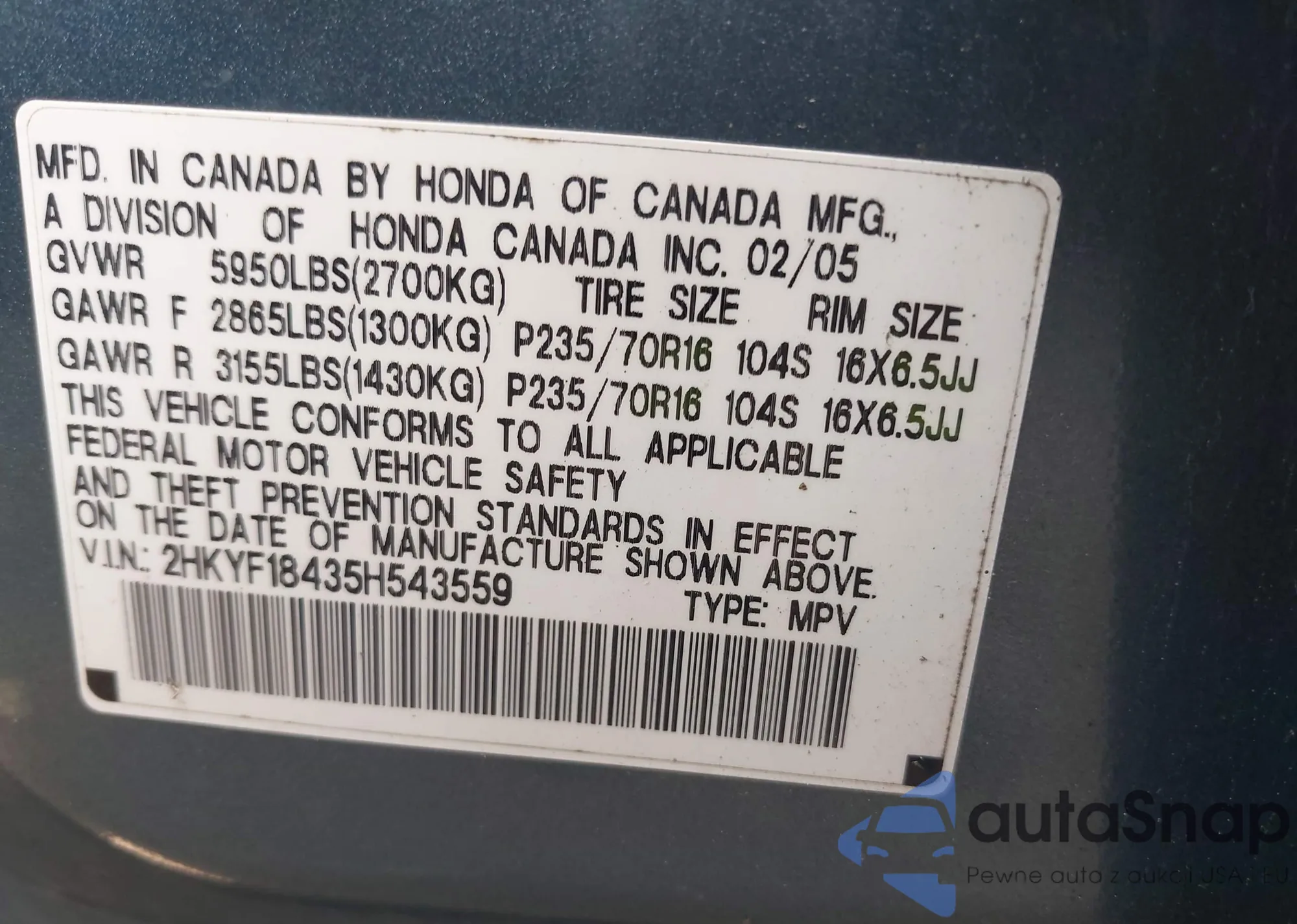 VIN: 2HKYF18435H543559