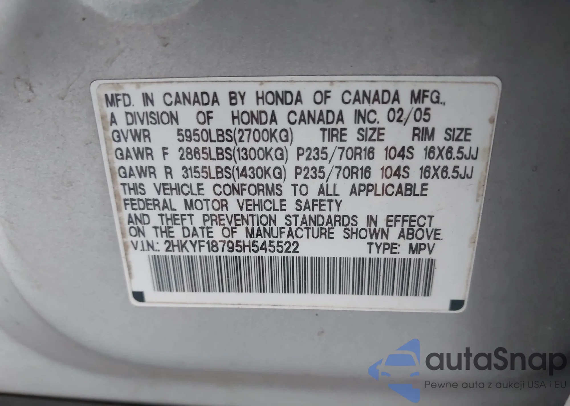 VIN: 2HKYF18795H545522