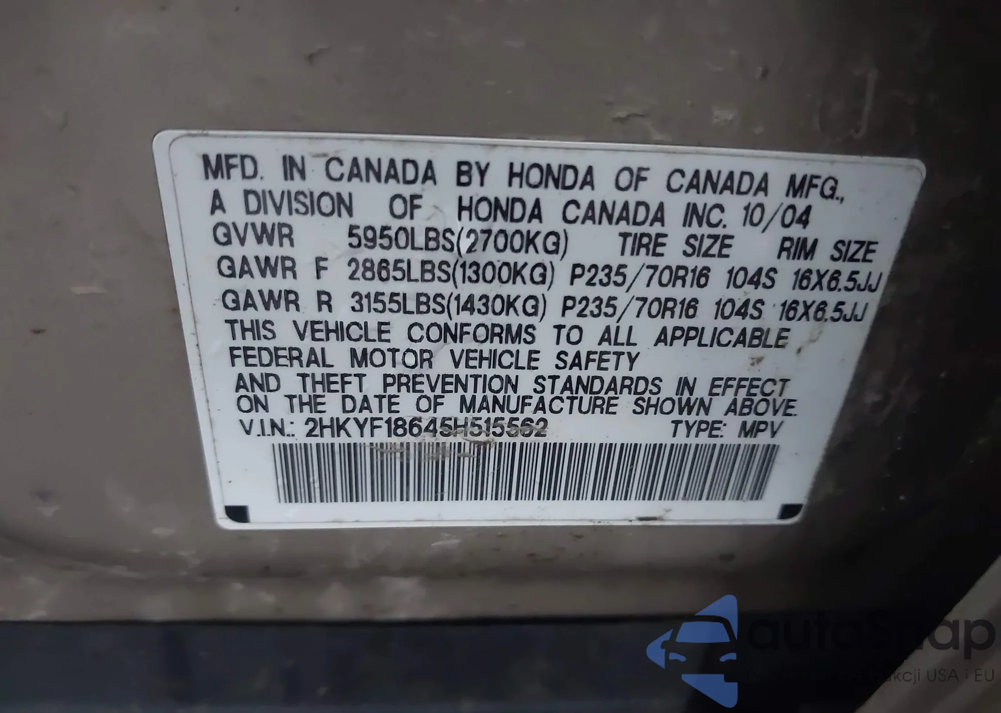 VIN: 2HKYF18645H515562