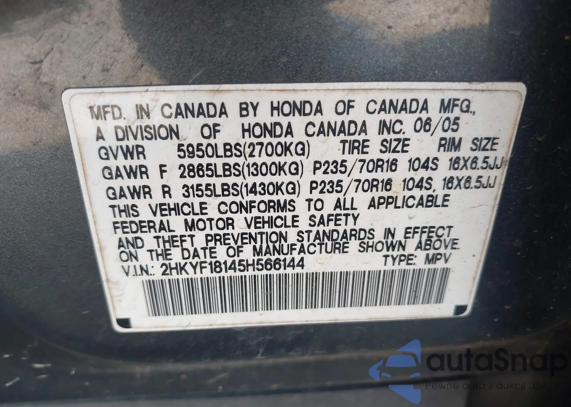 • VIN: 2HKYF18145H566144