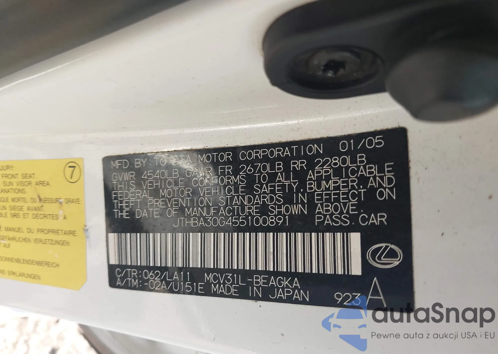 VIN: JTHBA30G455100891