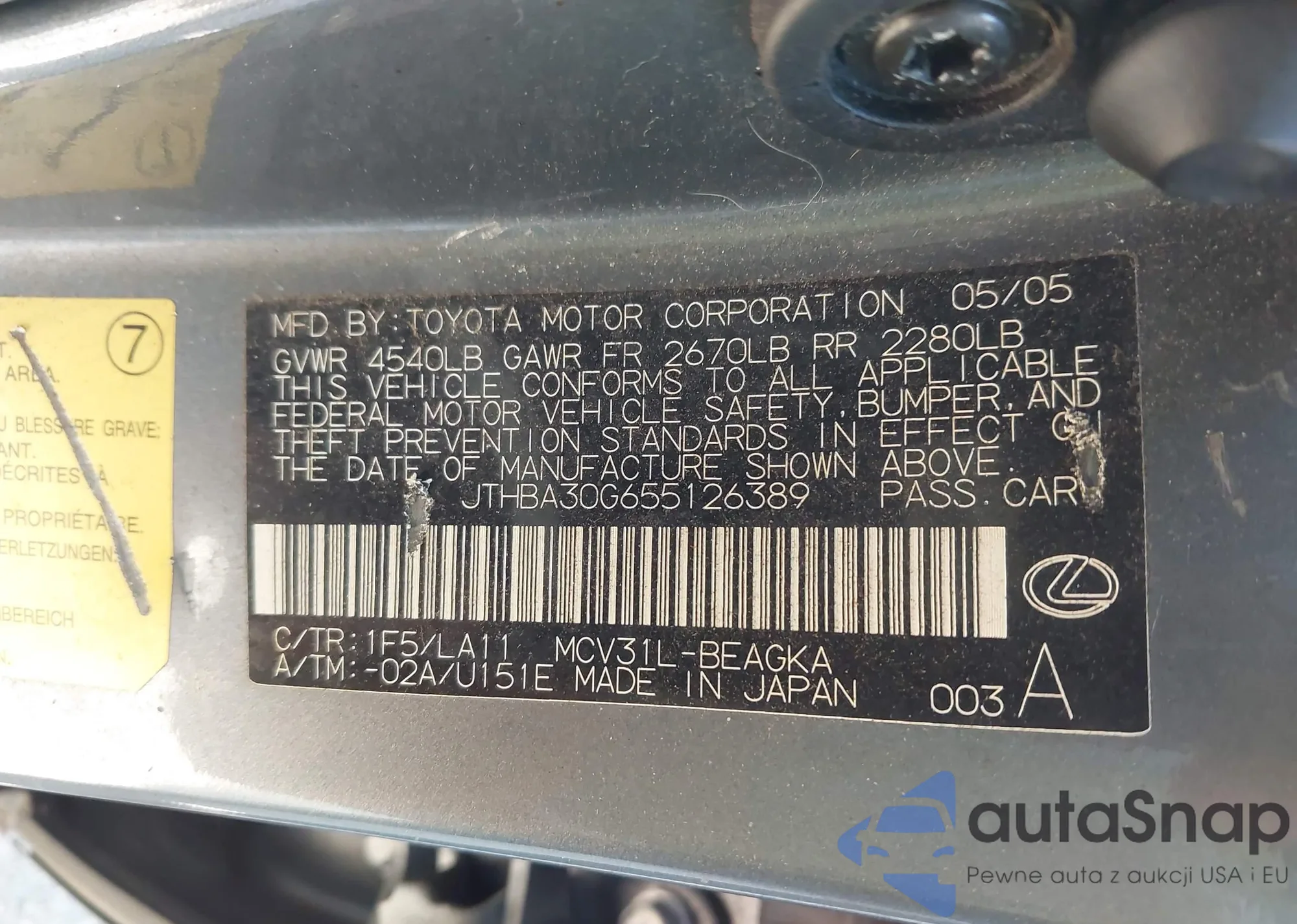 VIN: JTHBA30G655126389