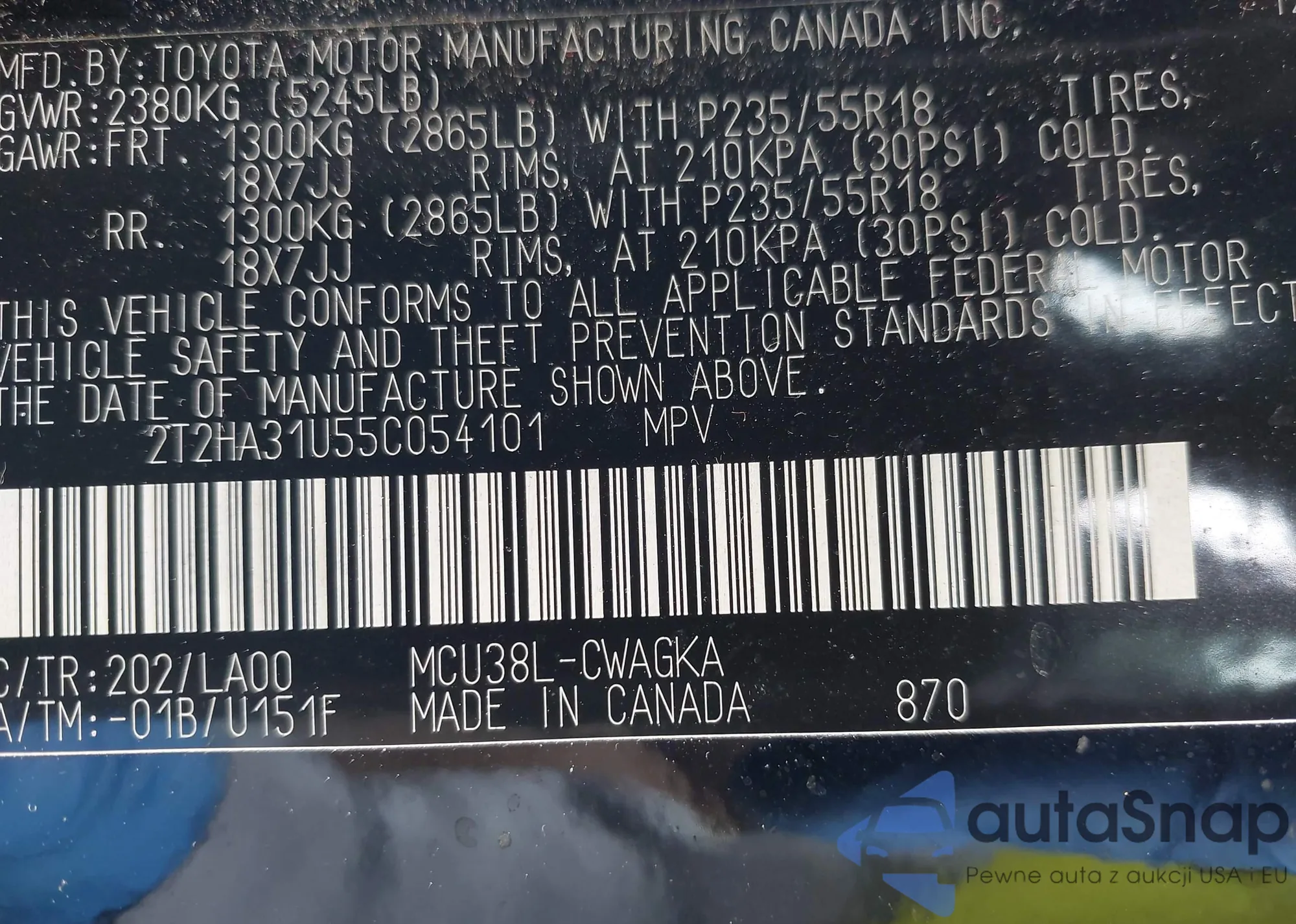 VIN: 2T2HA31U55C054101