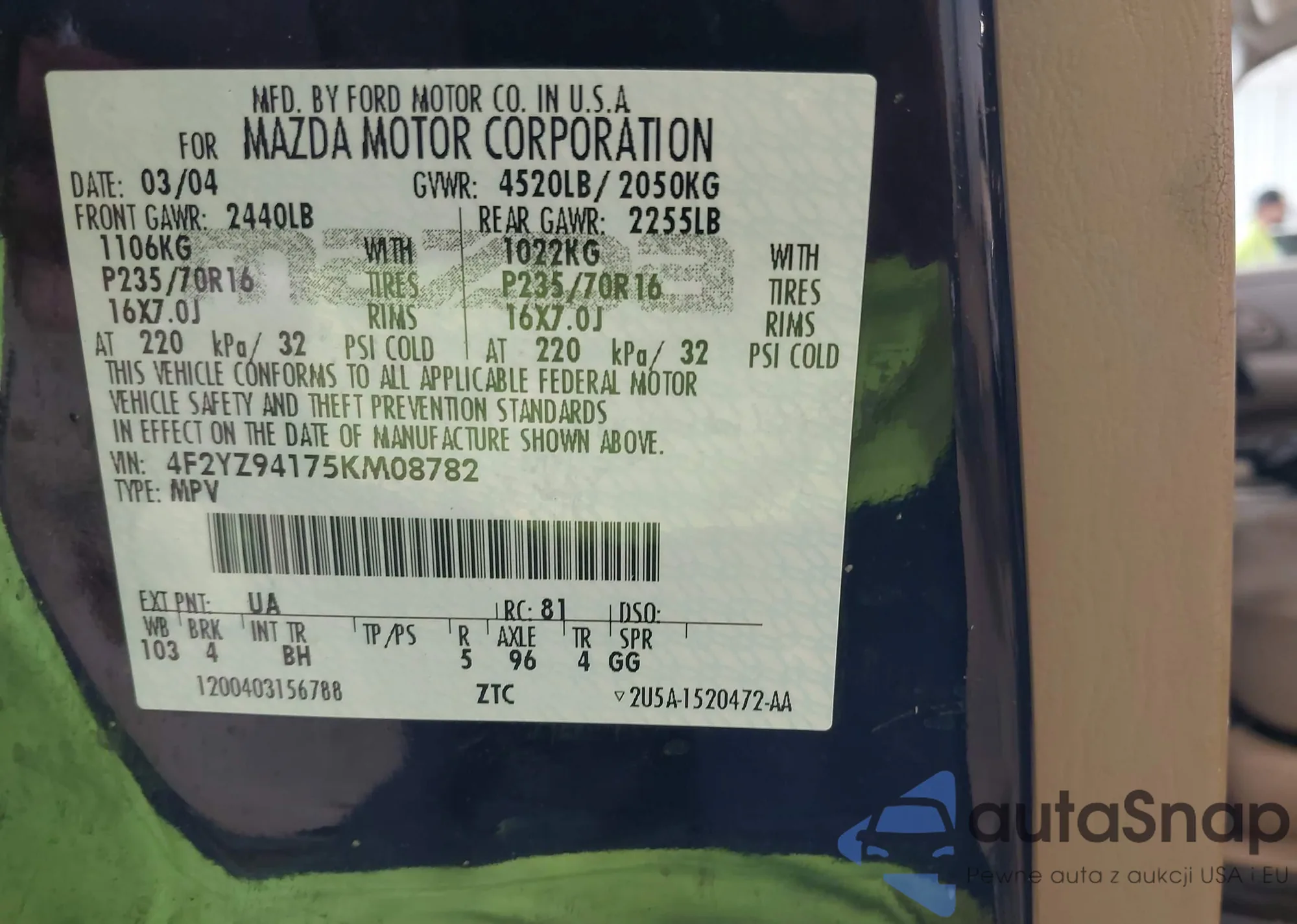 Автомобиль Mazda Tribute 2005 (VIN 4F2YZ94175KM08782) имеет документы, препятствующие регистрации. Могут возникнуть сложности при экспорте и регистрации. Обратитесь к экспертам AutaSnap для поиска альтернатив.