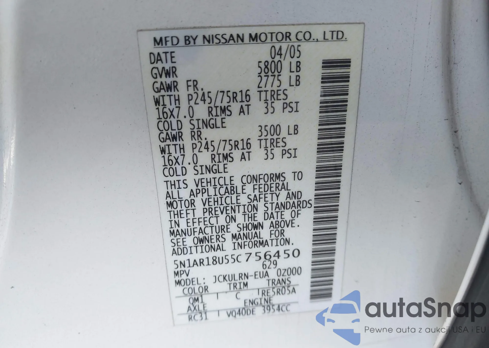 VIN: 5N1AR18U55C756450