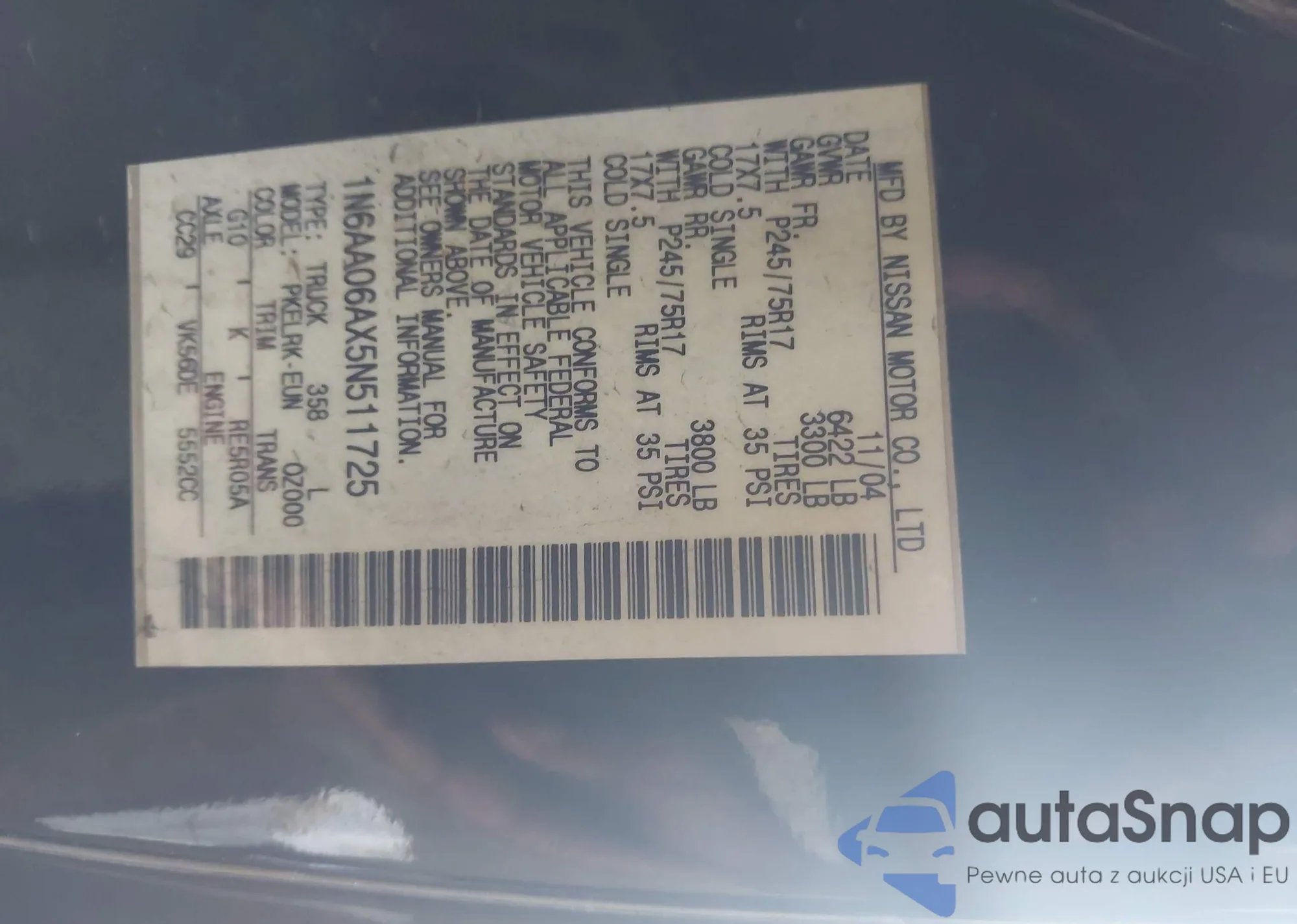 VIN: 1N6AA06AX5N511725
