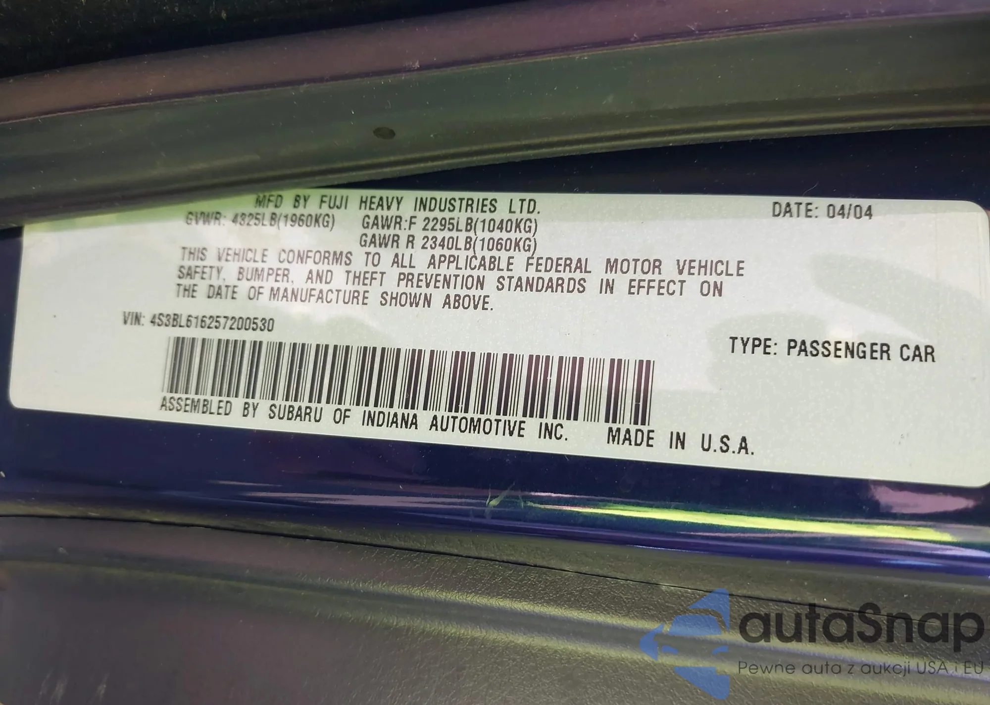 Автомобиль Subaru Legacy 2005 (VIN 4S3BL616257200530) ранее не участвовал в торгах. Документы чистые, пробег соответствует или ниже среднего по рынку. Продаётся страховой компанией — рекомендуем покупку. Доставка в порт займет около 6–8 недель.