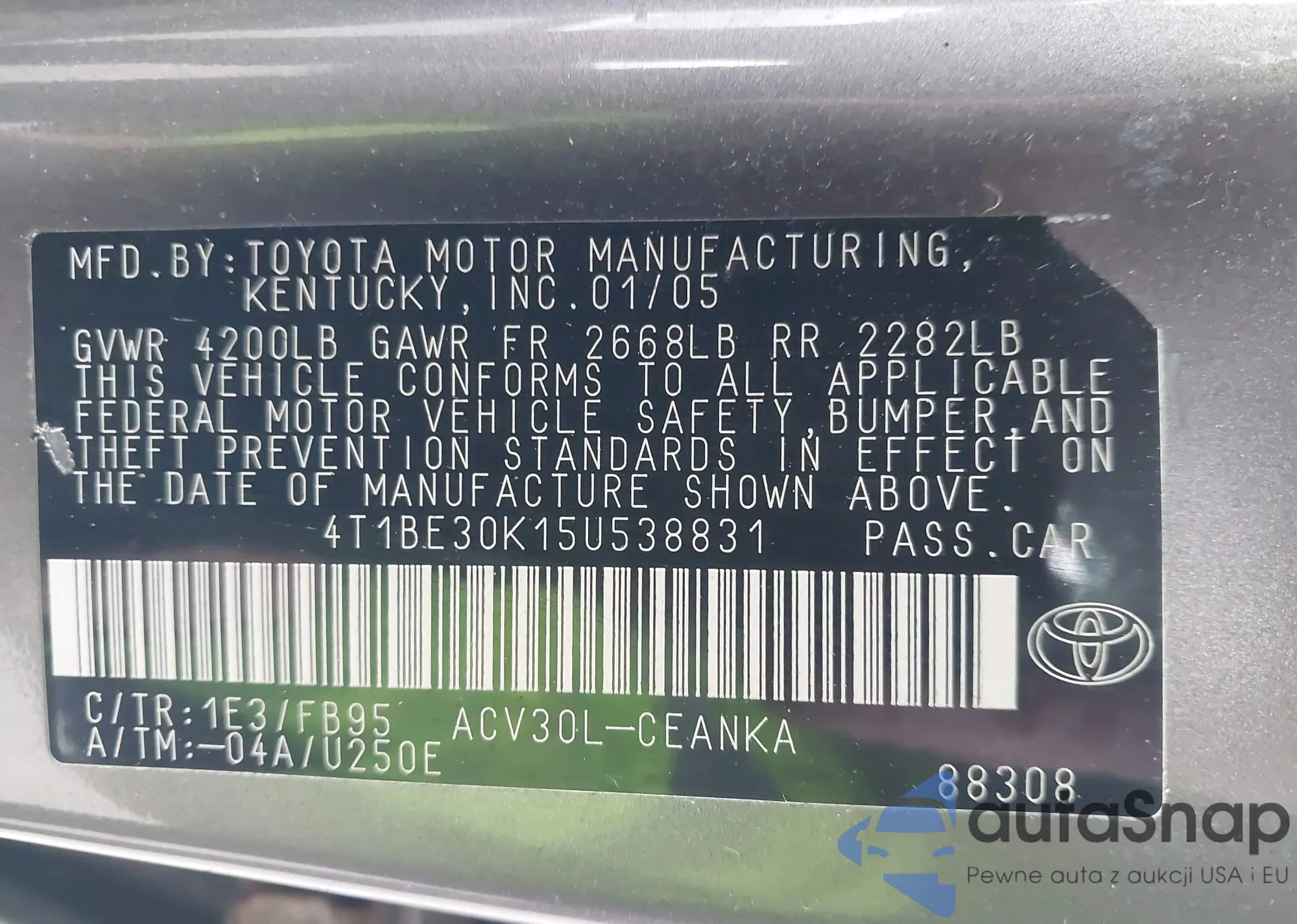 Автомобиль Toyota Camry 2005 (VIN 4T1BE30K15U538831) ранее не участвовал в торгах. Документы чистые, пробег соответствует или ниже среднего по рынку. Продаётся страховой компанией — рекомендуем покупку. Доставка в порт займет около 6–8 недель.