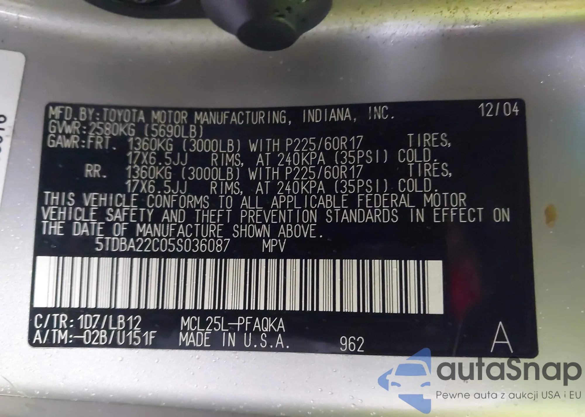 VIN: 5TDBA22C05S036087