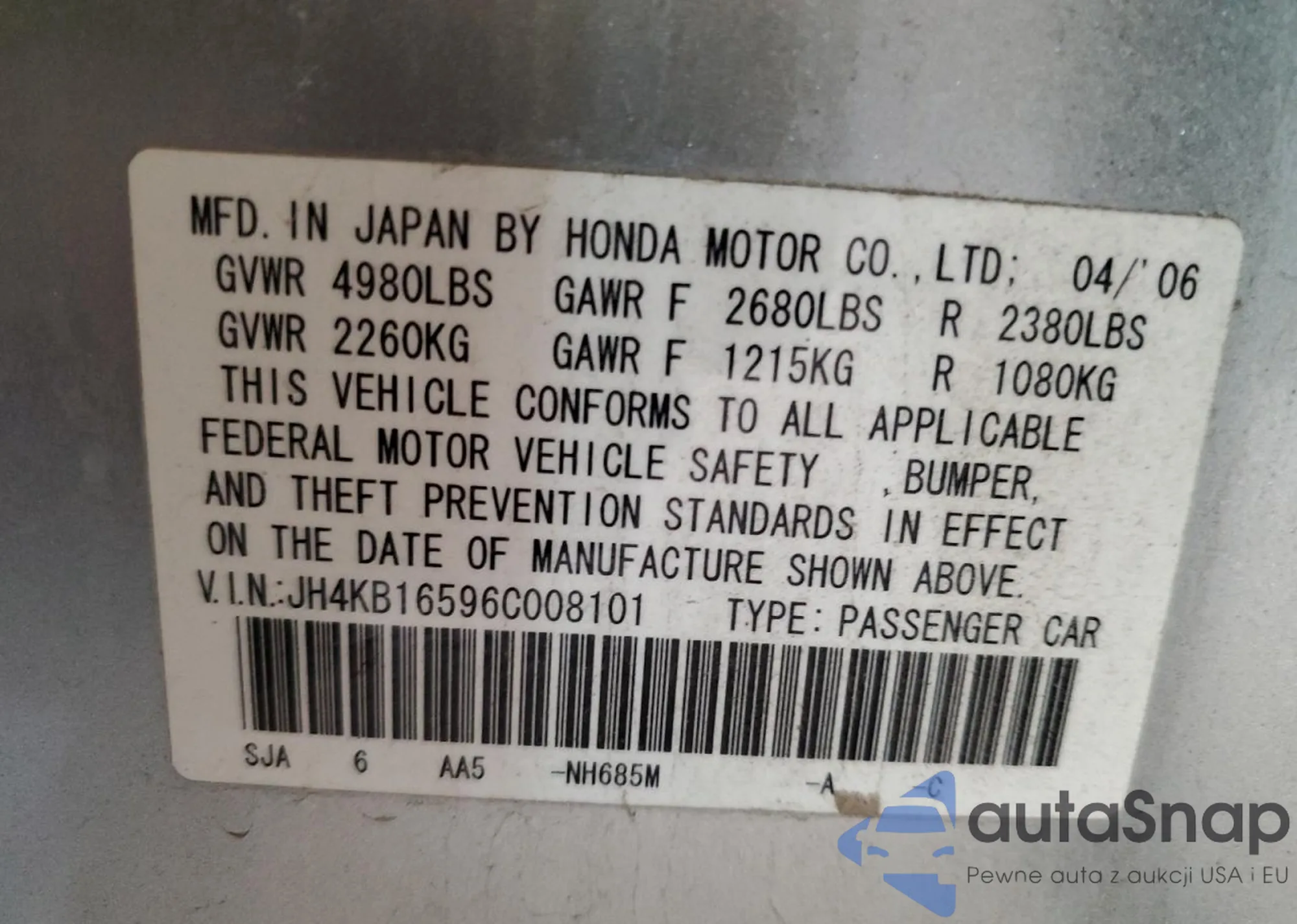 VIN: JH4KB16596C008101