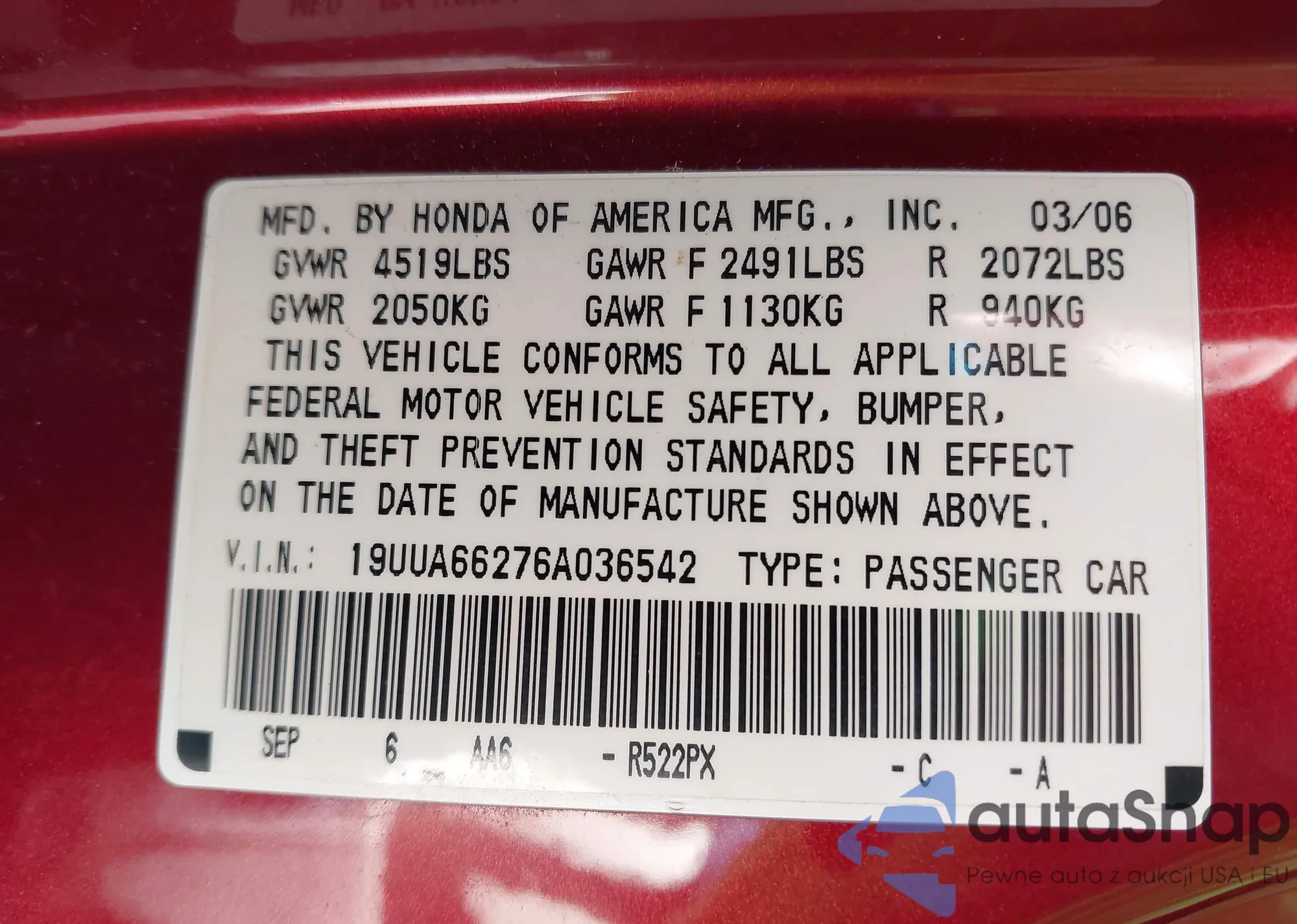 VIN: 19UUA66276A036542