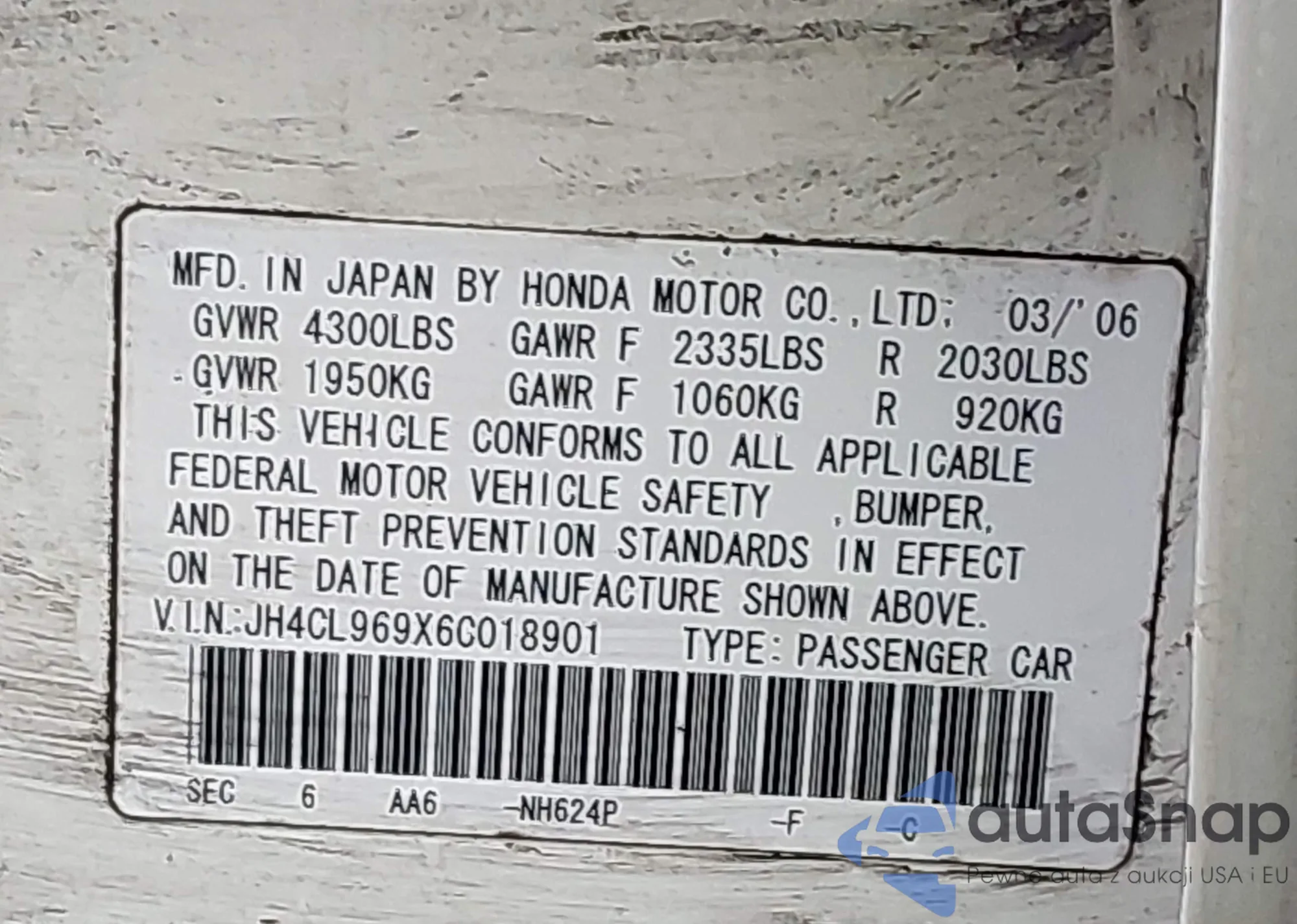 VIN: JH4CL969X6C018901