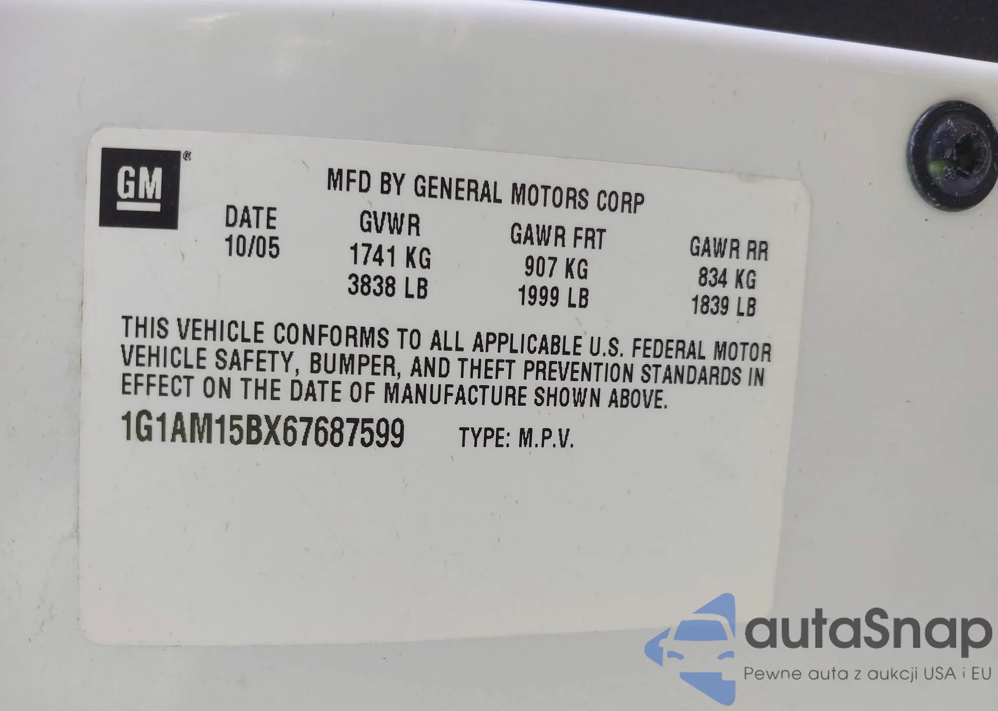 VIN: 1G1AM15BX67687599