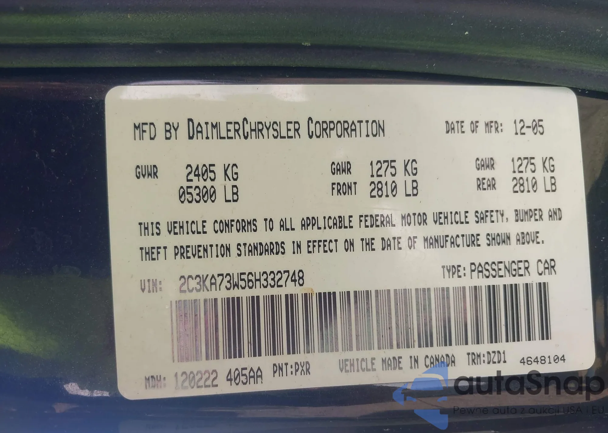 Автомобиль Chrysler 300C 2006 (VIN 2C3KA73W56H332748) имеет документы, препятствующие регистрации. Могут возникнуть сложности при экспорте и регистрации. Обратитесь к экспертам AutaSnap для поиска альтернатив.
