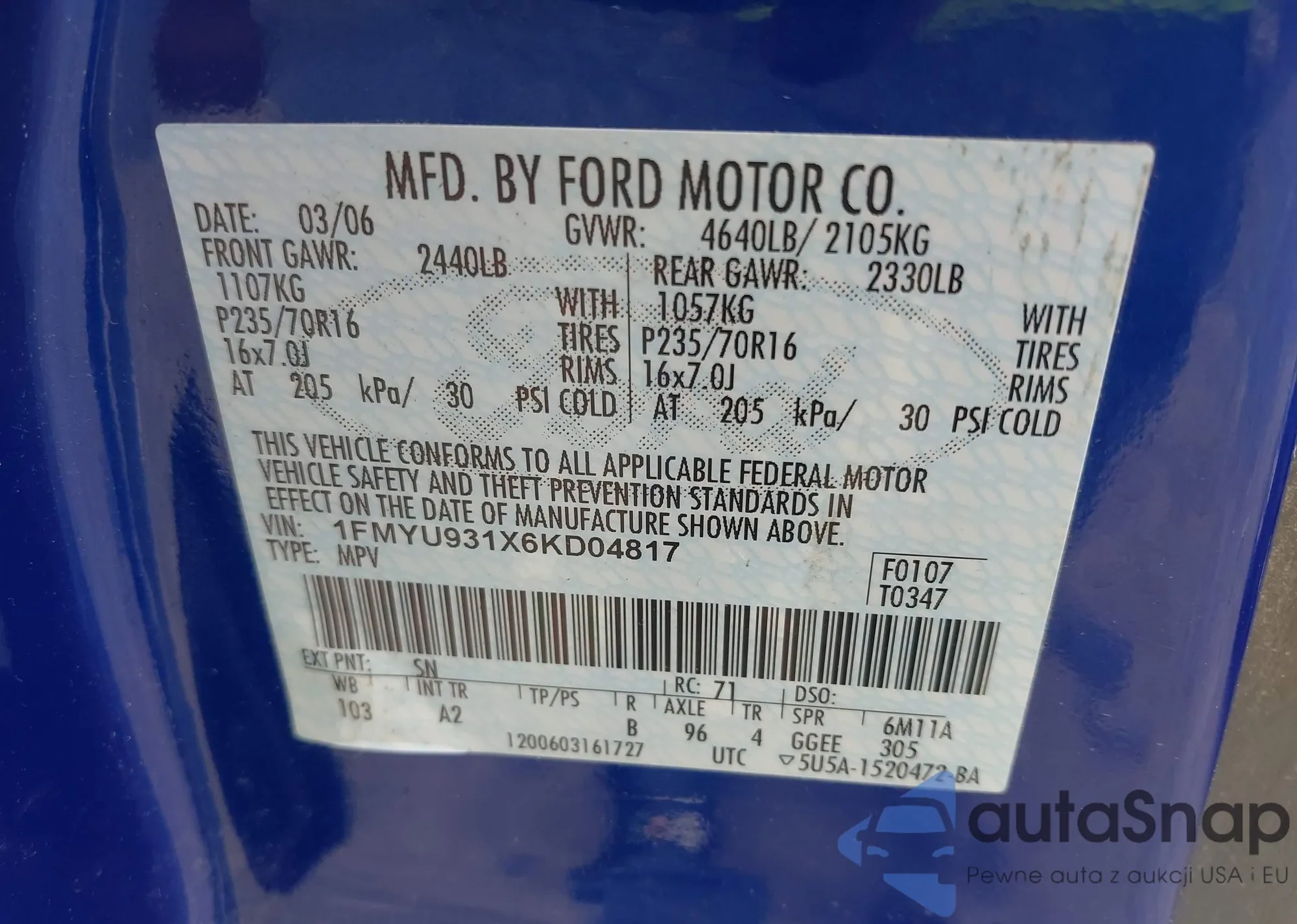 • VIN: 1FMYU931X6KD04817