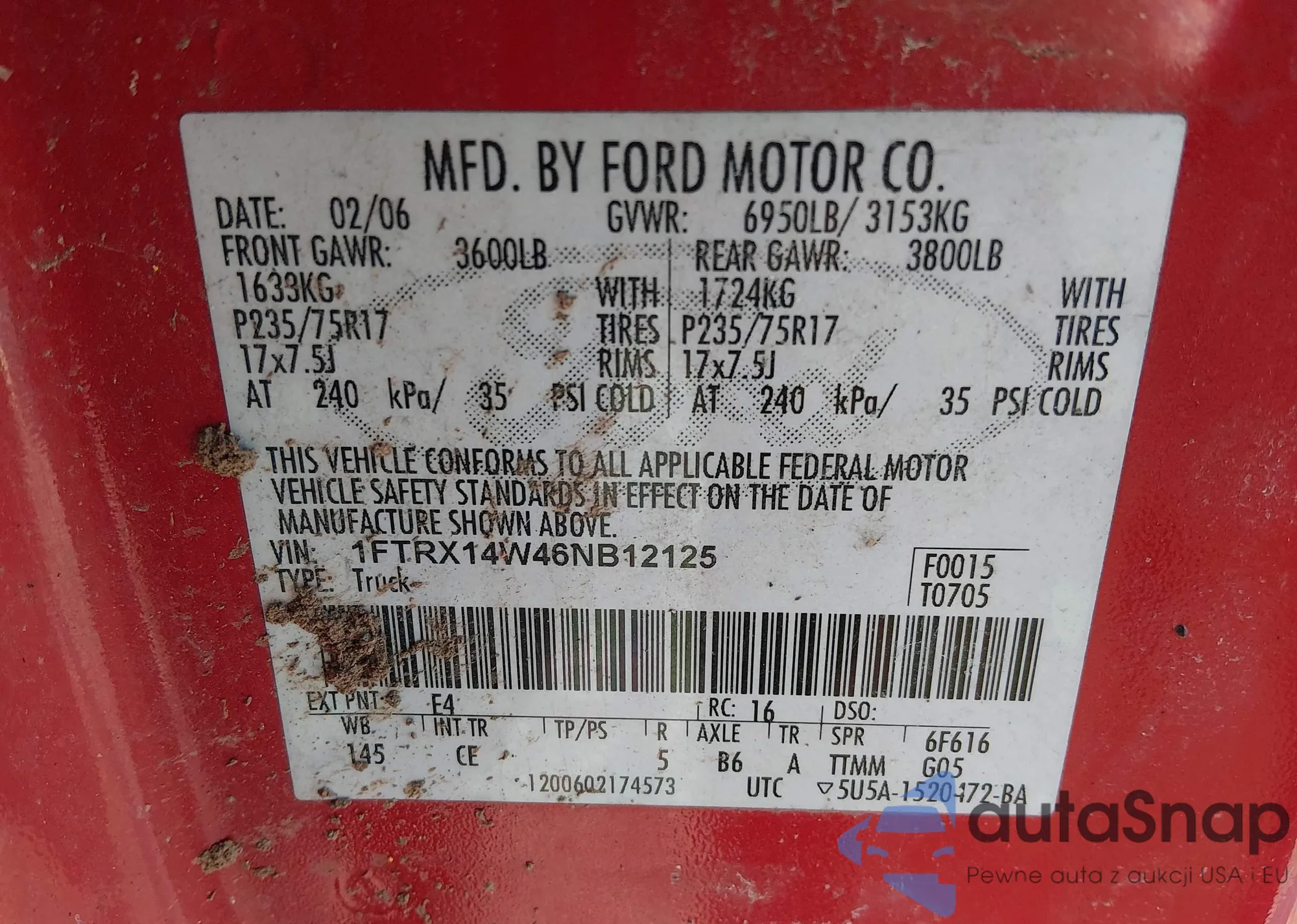 Автомобиль Ford F-150 2006 (VIN 1FTRX14W46NB12125) ранее не участвовал в торгах. Документы чистые, пробег соответствует или ниже среднего по рынку. Продаётся страховой компанией — рекомендуем покупку. Доставка в порт займет около 6–8 недель.