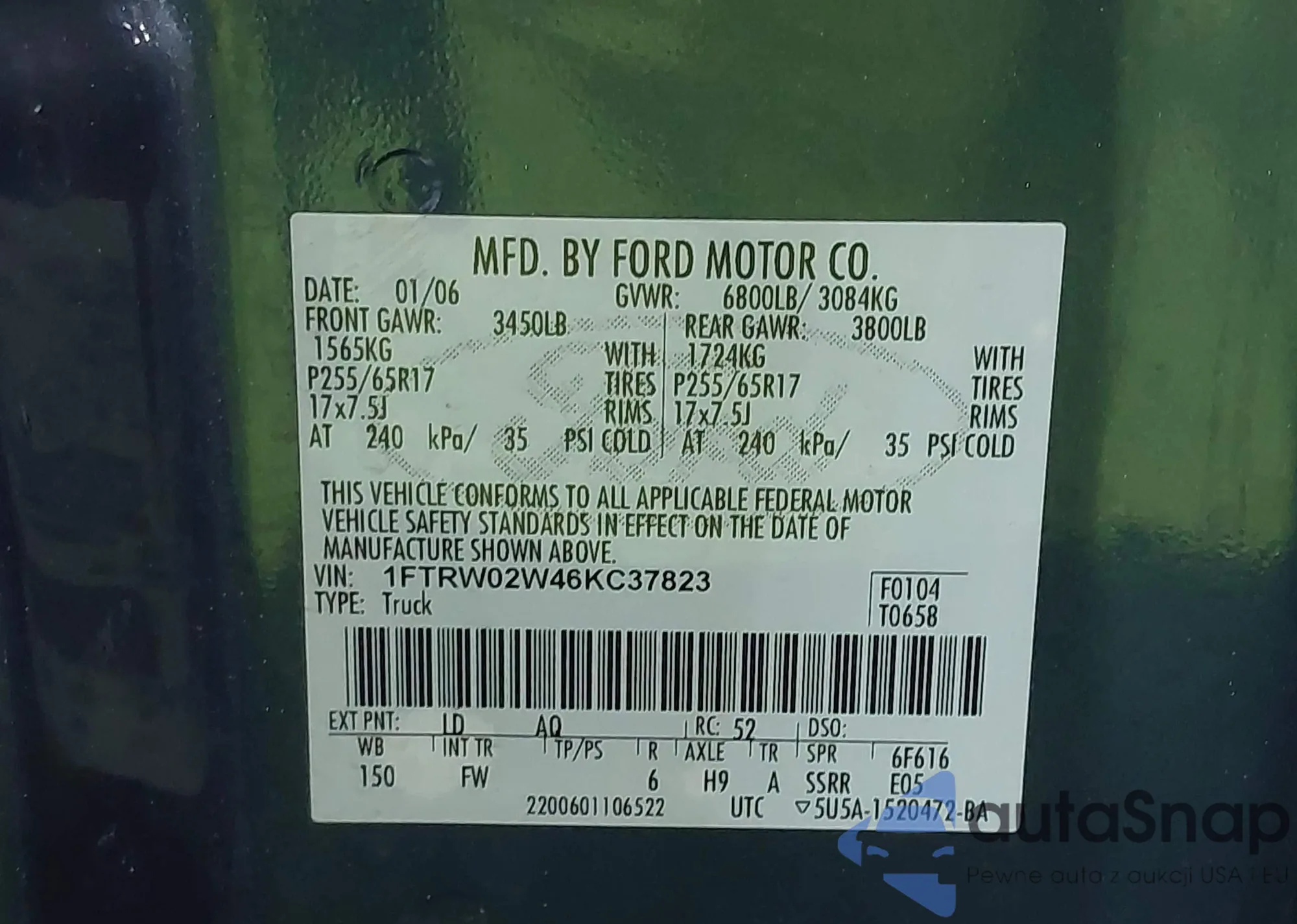 • VIN: 1FTRW02W46KC37823