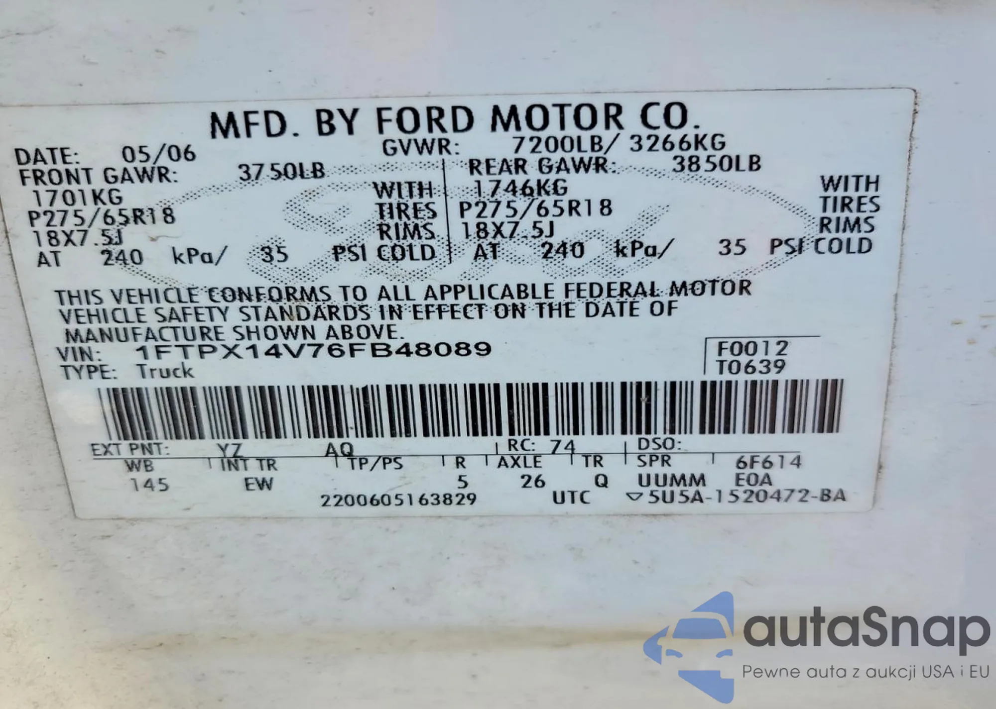 Автомобиль Ford F-150 2006 (VIN 1FTPX14V76FB48089) продаётся непроверенным продавцом. Рекомендуем проверить отчет Carfax и подтвердить возможность регистрации перед покупкой.