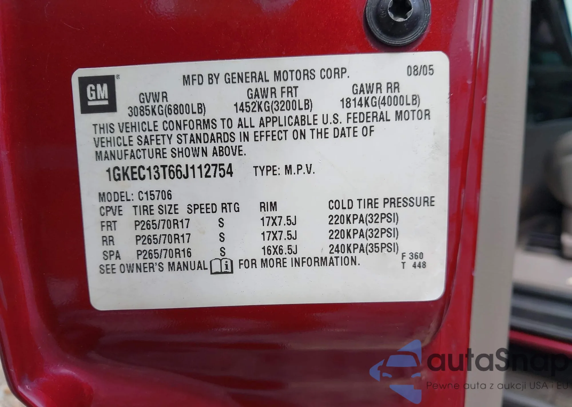 Автомобиль GMC Yukon 2006 (VIN 1GKEC13T66J112754) имеет документы, препятствующие регистрации. Могут возникнуть сложности при экспорте и регистрации. Обратитесь к экспертам AutaSnap для поиска альтернатив.