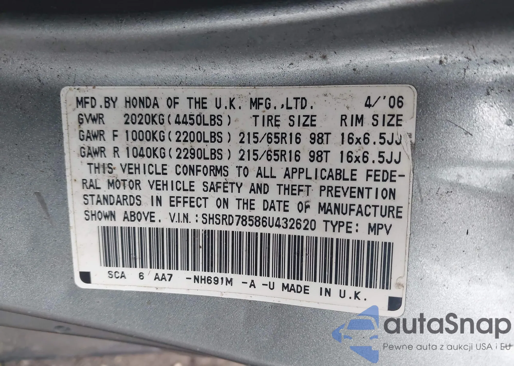 VIN: SHSRD78586U432620