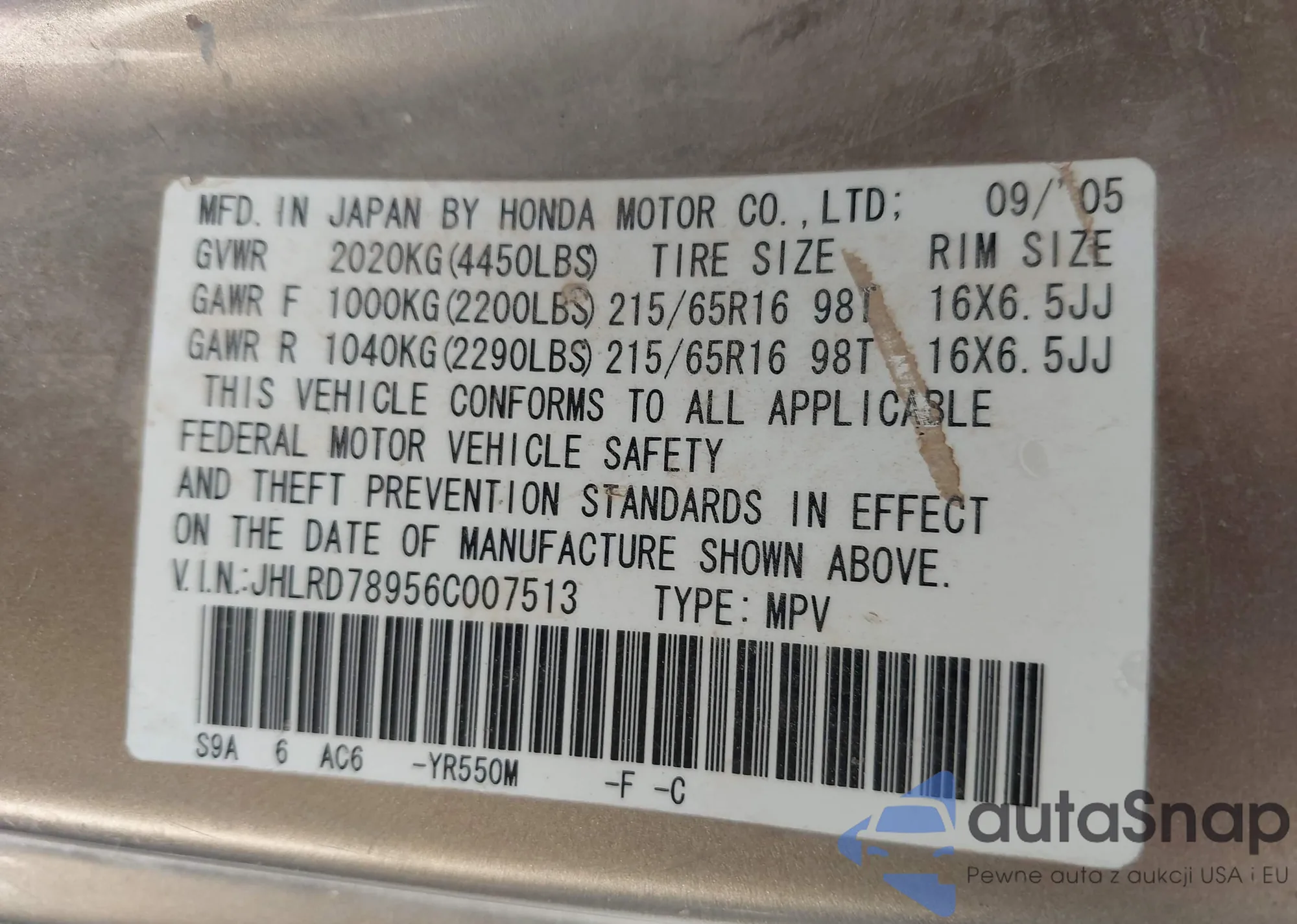 VIN: JHLRD78956C007513