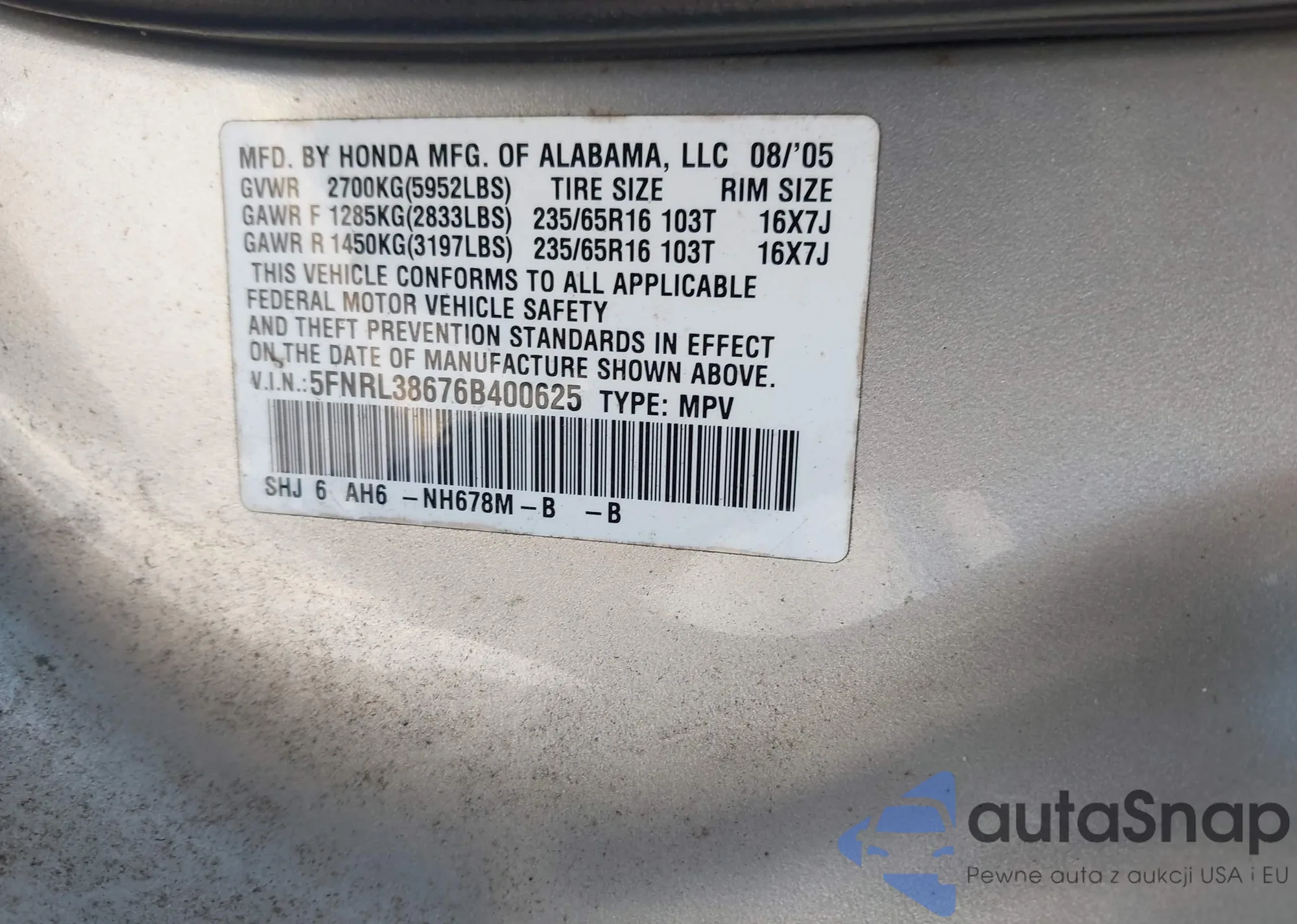 VIN: 5FNRL38676B400625