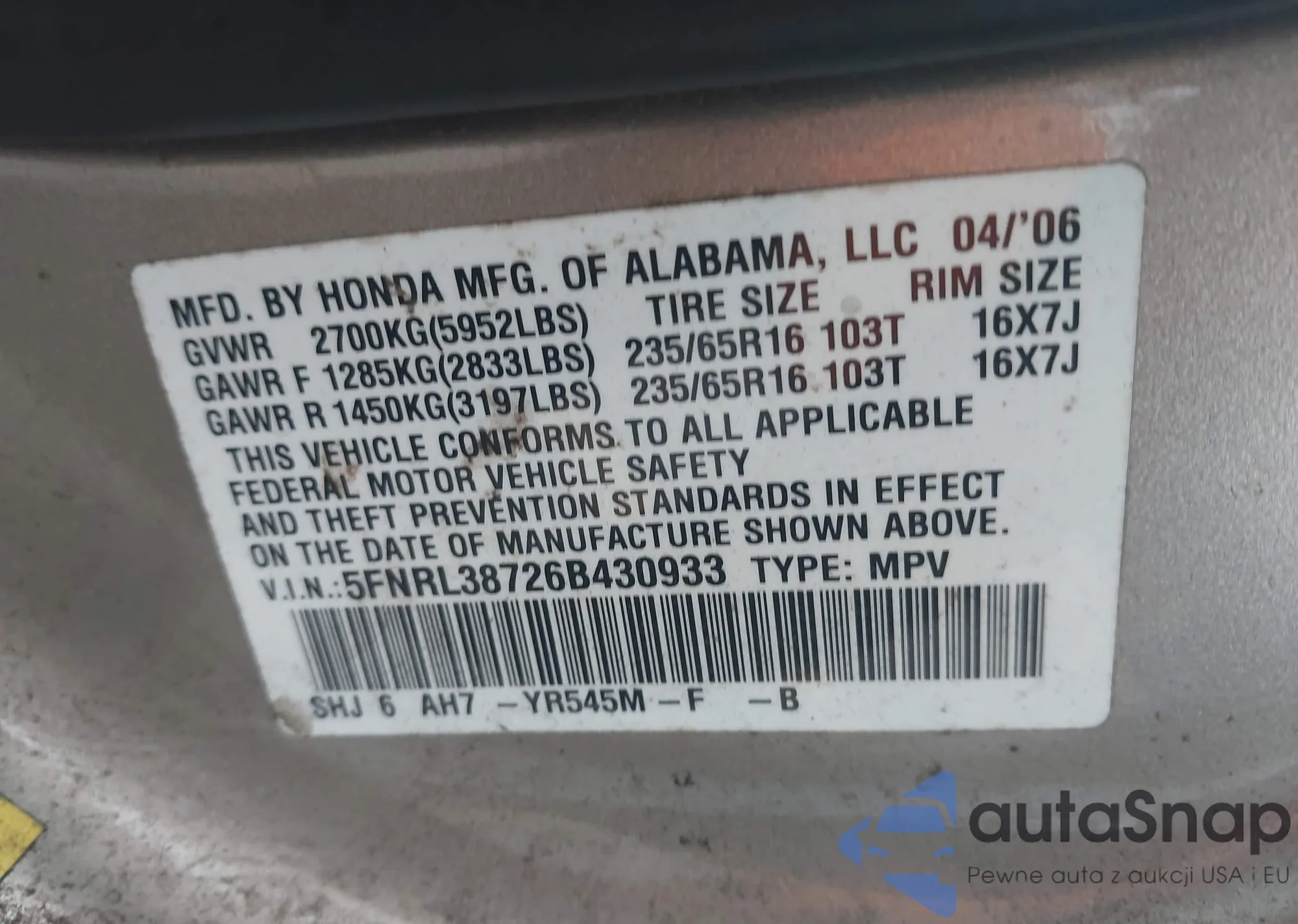 Автомобиль Honda Odyssey 2006 (VIN 5FNRL38726B430933) имеет документы, препятствующие регистрации. Могут возникнуть сложности при экспорте и регистрации. Обратитесь к экспертам AutaSnap для поиска альтернатив.