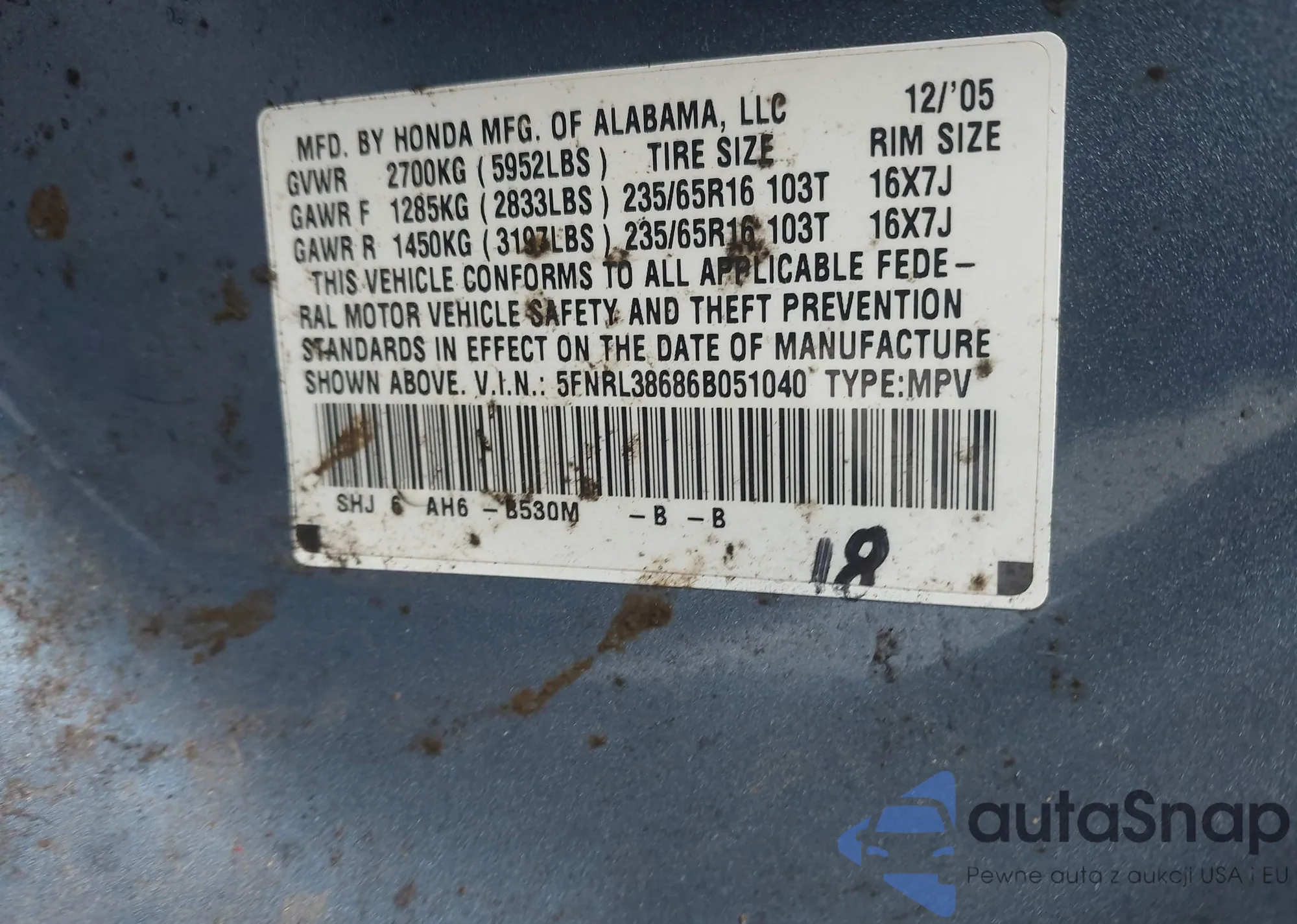 VIN: 5FNRL38686B051040